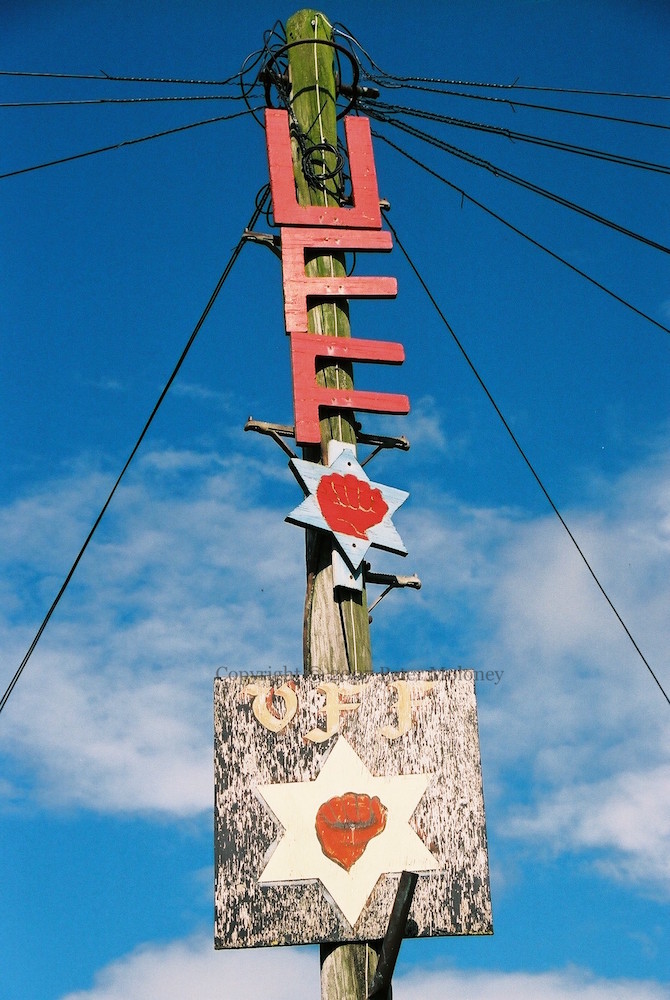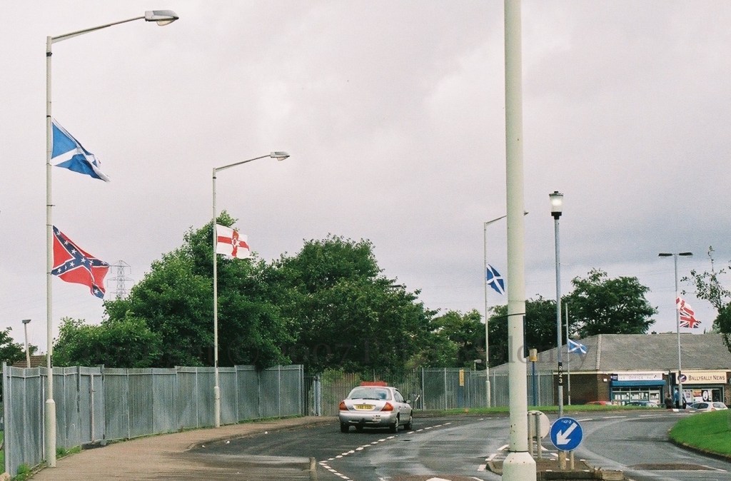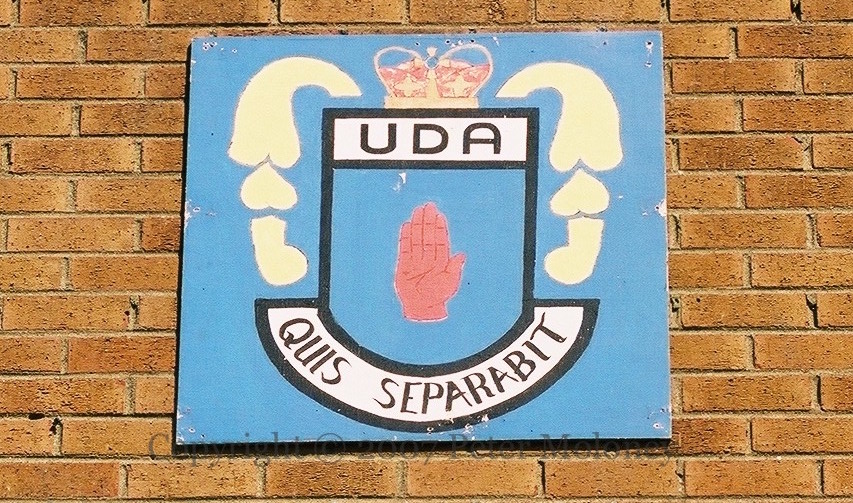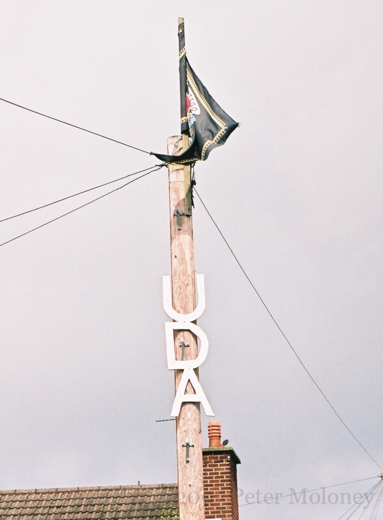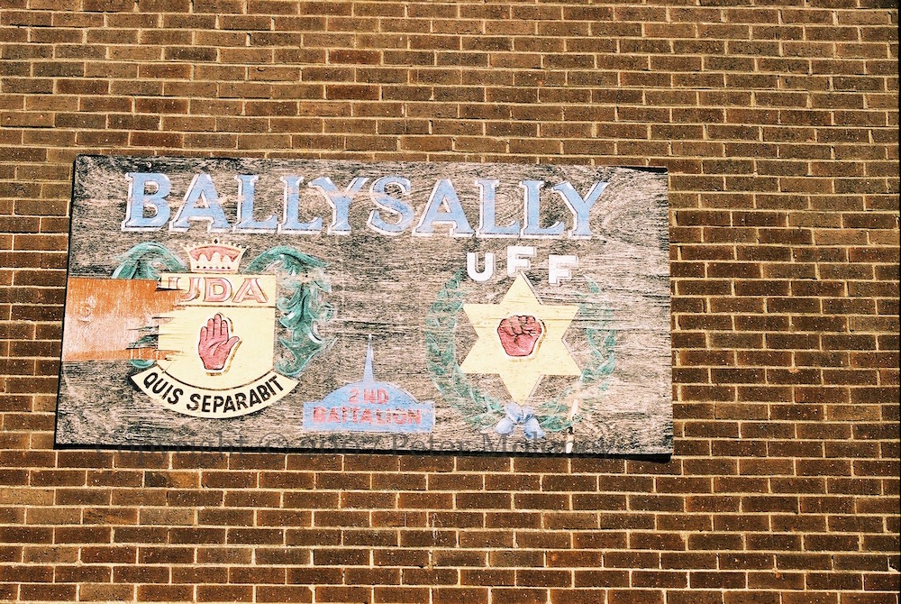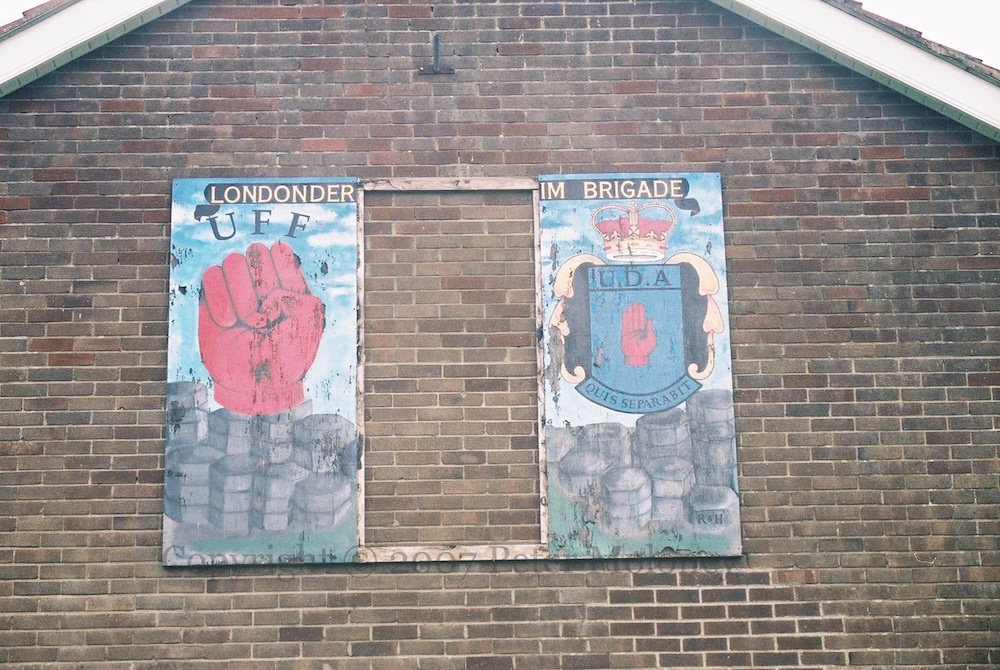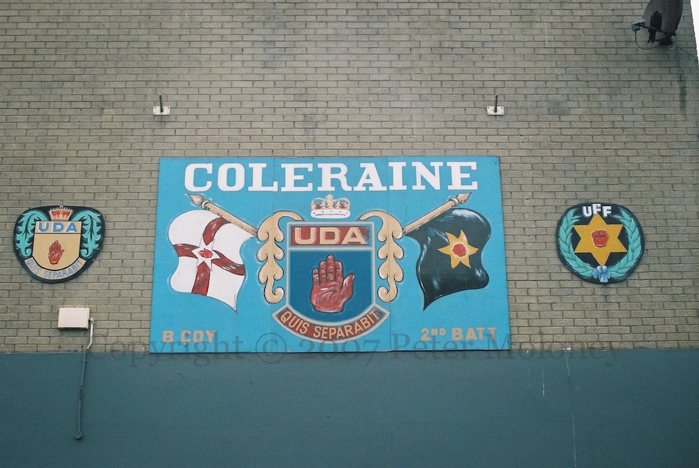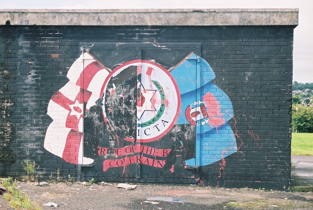 Two sides of the sub-station in Ballysally are painted, one with UDA “invicta” and Pride Of The Bann (flute band), the other with UYM [Ulster Young Militants, UDA youth].