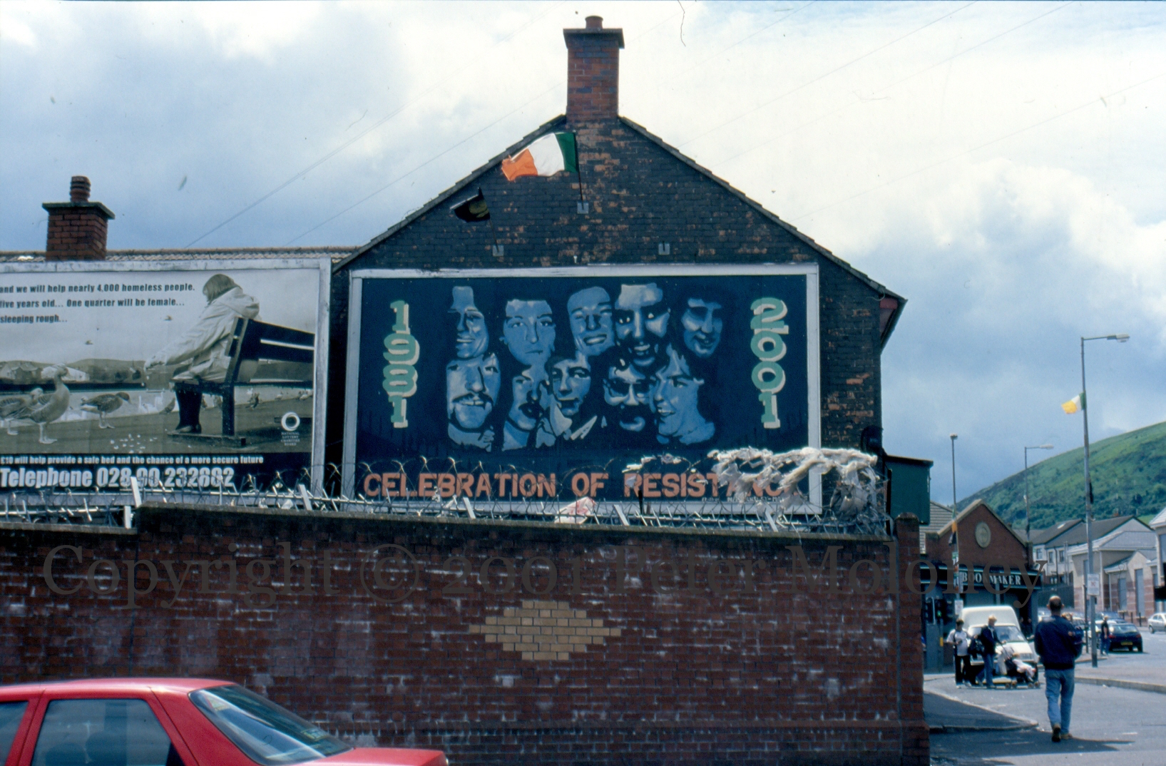 Commemoration of the 20th anniversary of the 1981 hunger strikes on an advertising hoarding on the Springfield Road, Belfast, previously the site of Vote Adams X and before that, Victory To The Blanketmen.