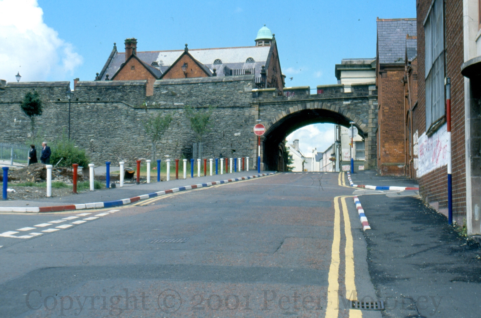 The Sınn Féın offices and shop on the Falls Road at Sevastopol Street were torn down and rebuilt in 2000. A mural had been on the gable wall since 1982, initially advertising An Phoblacht/Republican News, and later included Bobby Sands. (1989 white | 1990 blue)