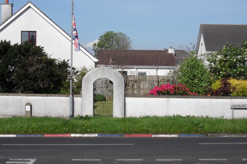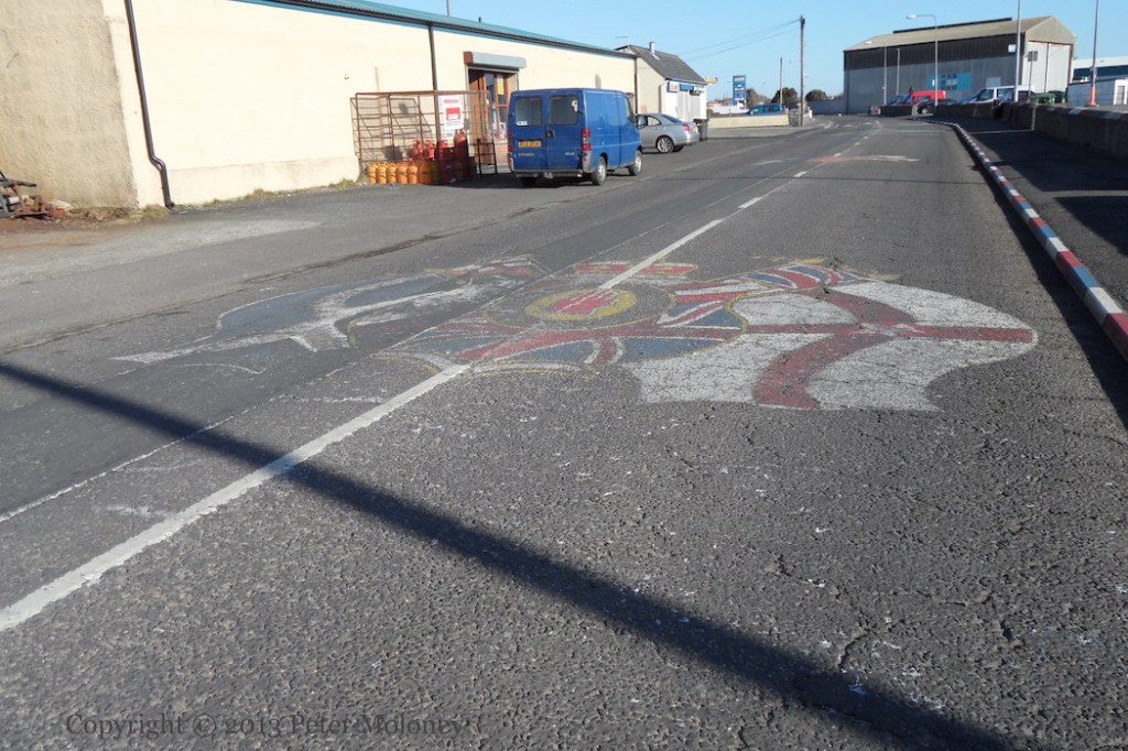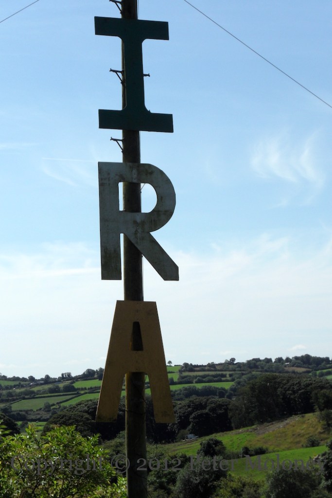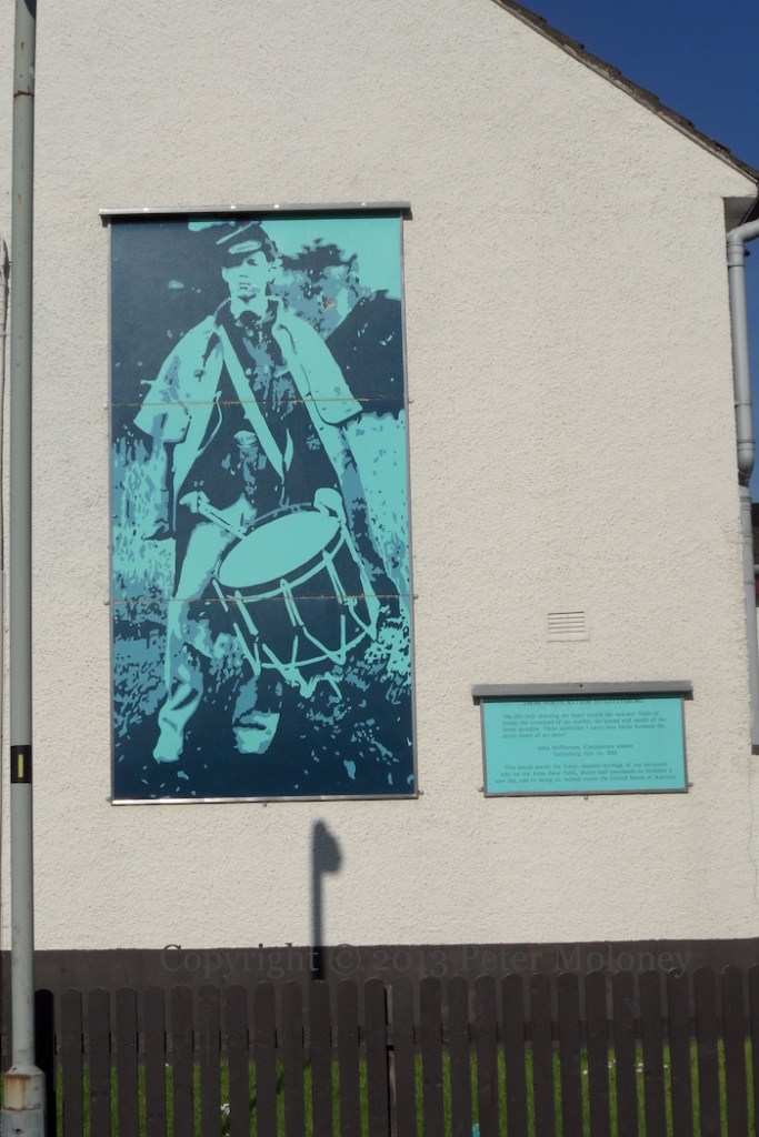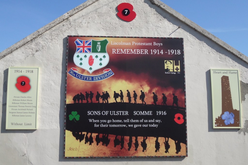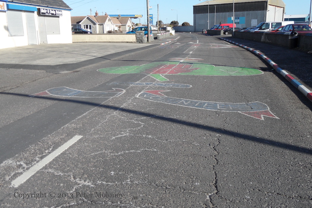 Bobby Sands has been replaced at the centre of this Enniskillen board by a copy of the 1916 Proclamation flanked by Easter lilies. (See the previous version.) The rest of the board remains the same: graveside mourners surrounded by the four provinces and Celtic knotwork. The sunburst and starry plough have been painted in the corners of the out-building.