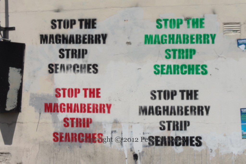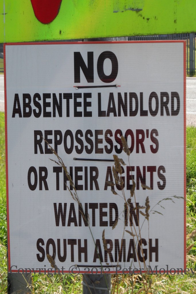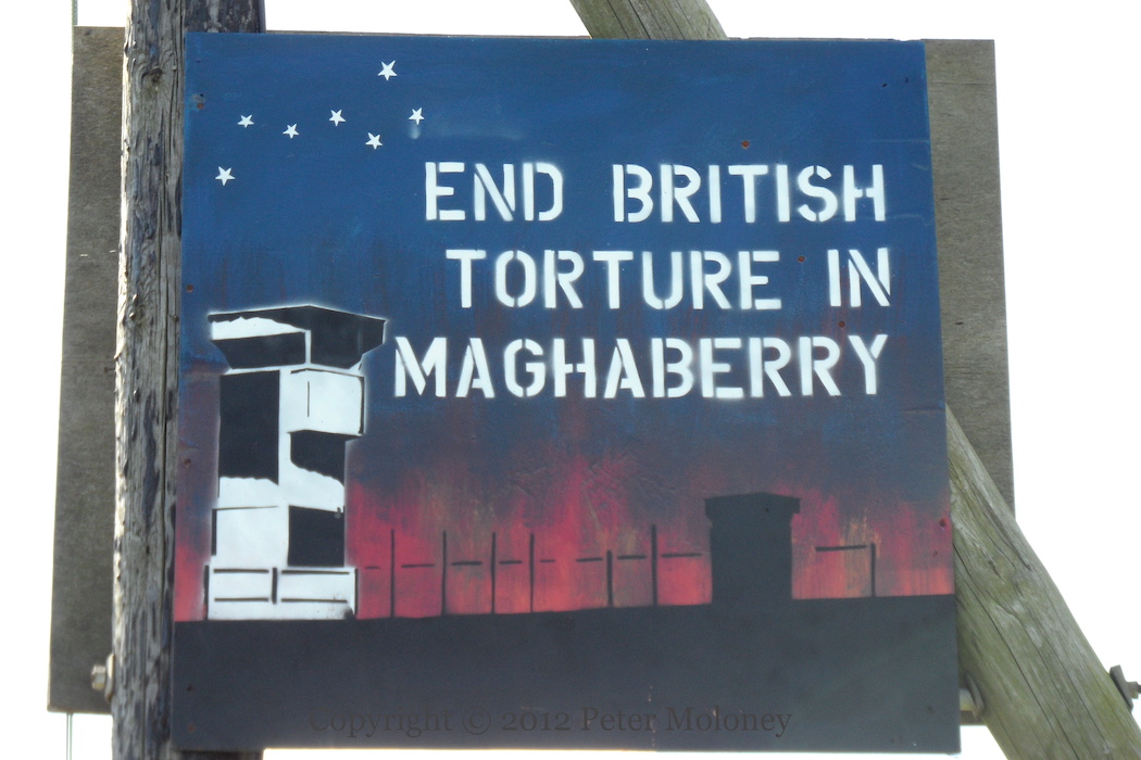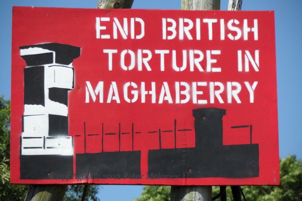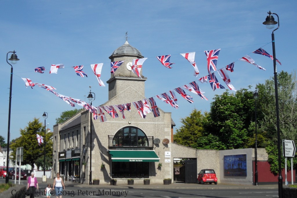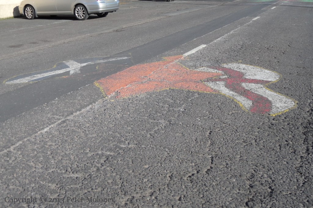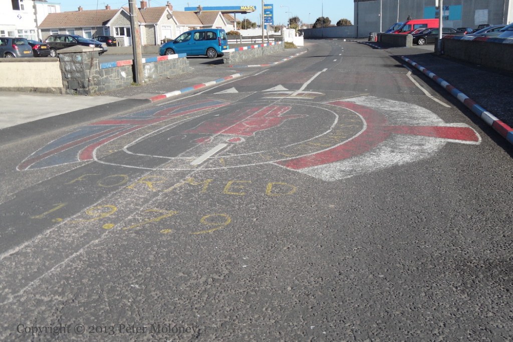 Bobby Sands has been replaced at the centre of this Enniskillen board by a copy of the 1916 Proclamation flanked by Easter lilies. (See the previous version.) The rest of the board remains the same: graveside mourners surrounded by the four provinces and Celtic knotwork. The sunburst and starry plough have been painted in the corners of the out-building.
