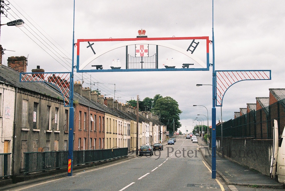 The Garvaghy Road, Portadown, arch has a pair of gates and a cannon and sailing ship: symbols of the Siege Of Derry, as well as the cross, ladder, and crown & Bible of the Orange Order. IN the centre is an Ulster Banner (with a Union Flag on the reverse).