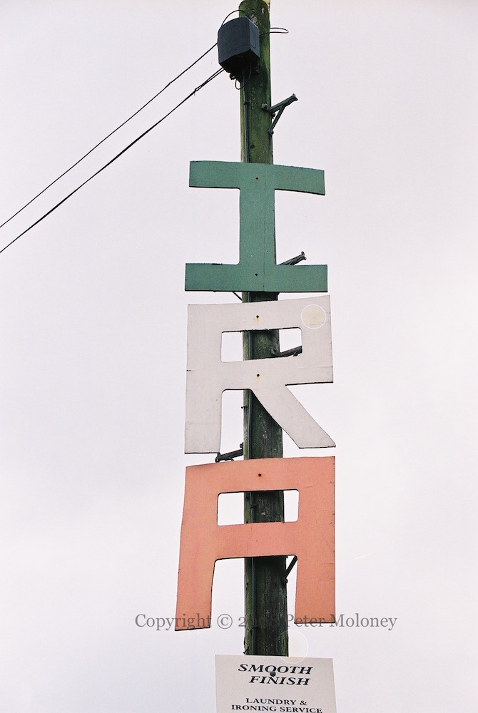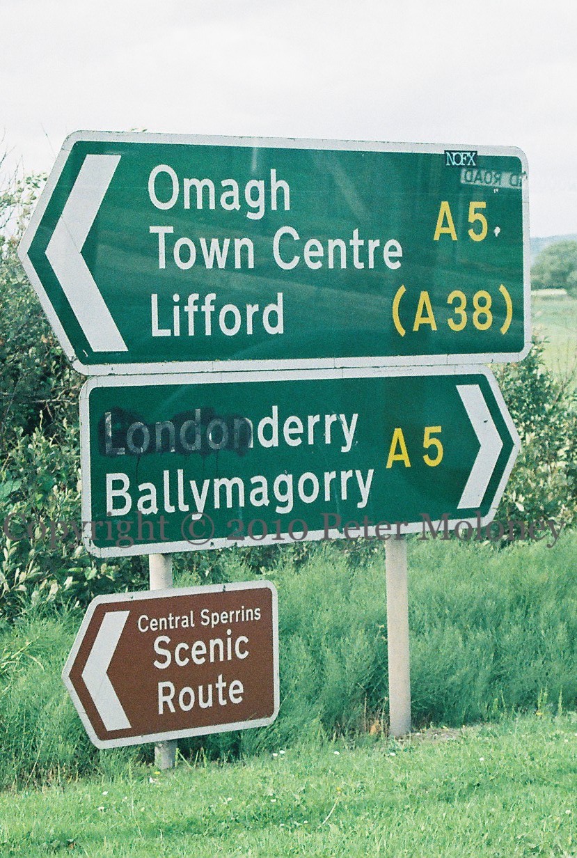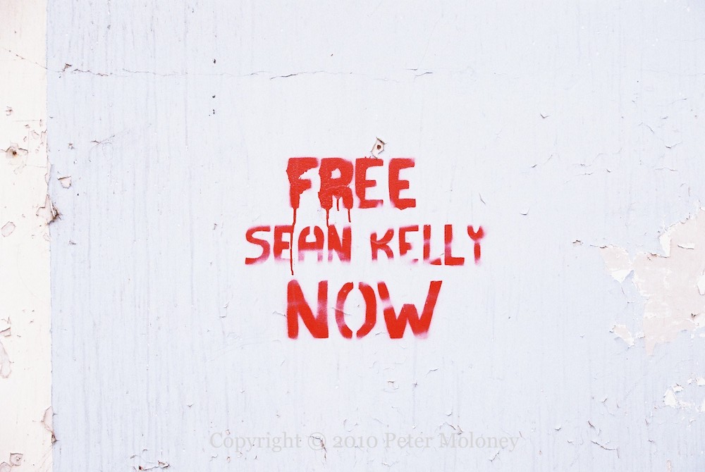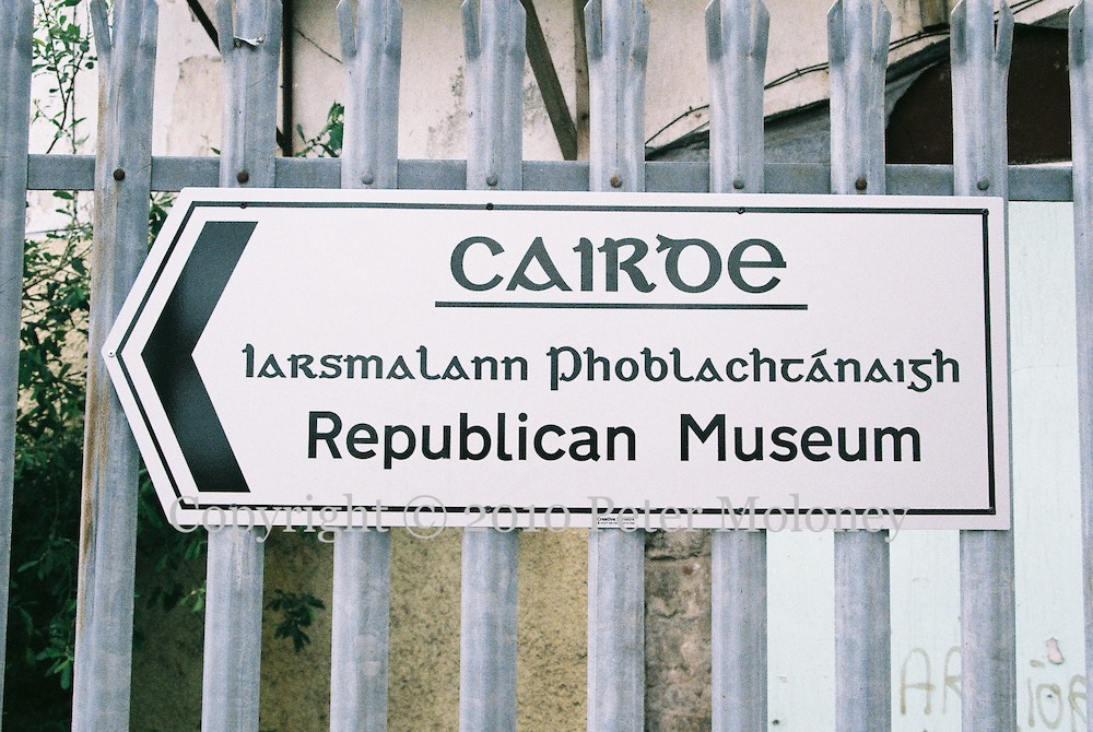 A new sign directs people crossing the bridge out of Strabane centre towards Caırde [Friends] republican museum. With a vintage “Free Sean Kelly Now” stencil on the wall behind it.