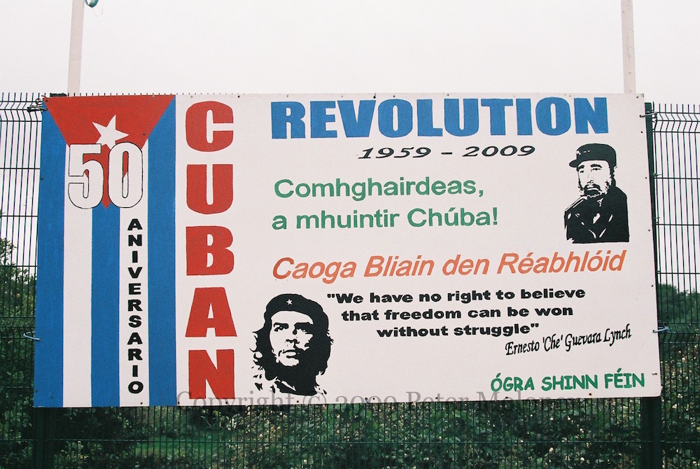“50 aniversario Cuban Revolution 1959-2009. Comhgaırdeas a mhuıntır Chúba! [Congratulations, people of Cuba!] Caoga blıaın den réabhlóıd. [Fifty years of the revolution.] ‘We have no right to believe that freedom can be won without struggle’ – Ernesto ‘Che’ Guevara Lynch. Ógra Shınn Féın.” International board in Meetinghouse Street, Strabane, with portraits of Fidel Castro and (Jim Fitzpatrick’s) Che.