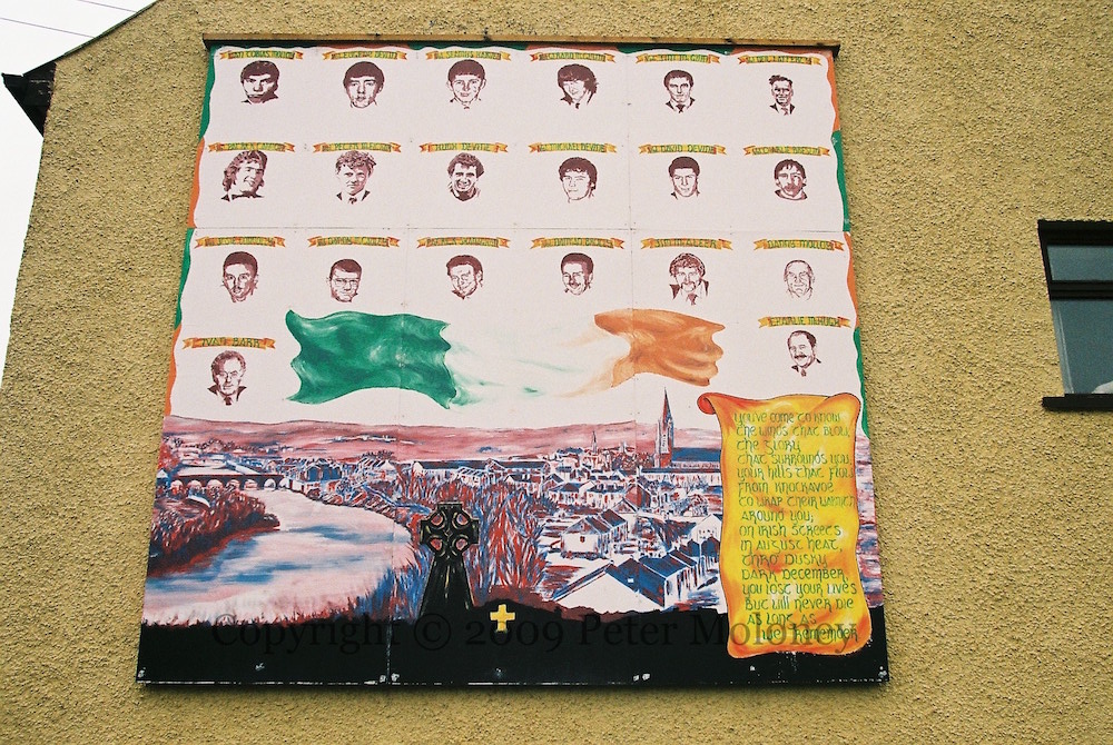 The river Mourne flows through Strabane town, home to 20 IRA volunteers and Sinn Féin activists who died during the Troubles: Fian Tobias Molloy, Vol. Eugene Devlin, Vol. Seamus Harvey, Vol. Gerard McGlynn, Vol. Jim McGinn, Vol. Neil Lafferty, Vol. Patrick Cannon, Vol. Peter McElchar, Hugh Devine, Vol. Michael Devine, Vol. David Devine, Vol. Charles Breslin, Vol. Josie Connolly, Vol. Danny McCauley, Patrick Shanaghan, Vol Damian Brolloy, Jim McAleer, Ivan Barr, Charlie McHugh.