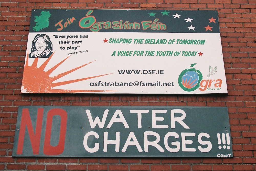 This BBC page gives a brief history of water charges in Northern Ireland up to 2009, eight years after they were originally to be introduced. The protesting board above – “No water charges”, below an Ógra Shınn Féın board, is in Bridge Street, Strabane.