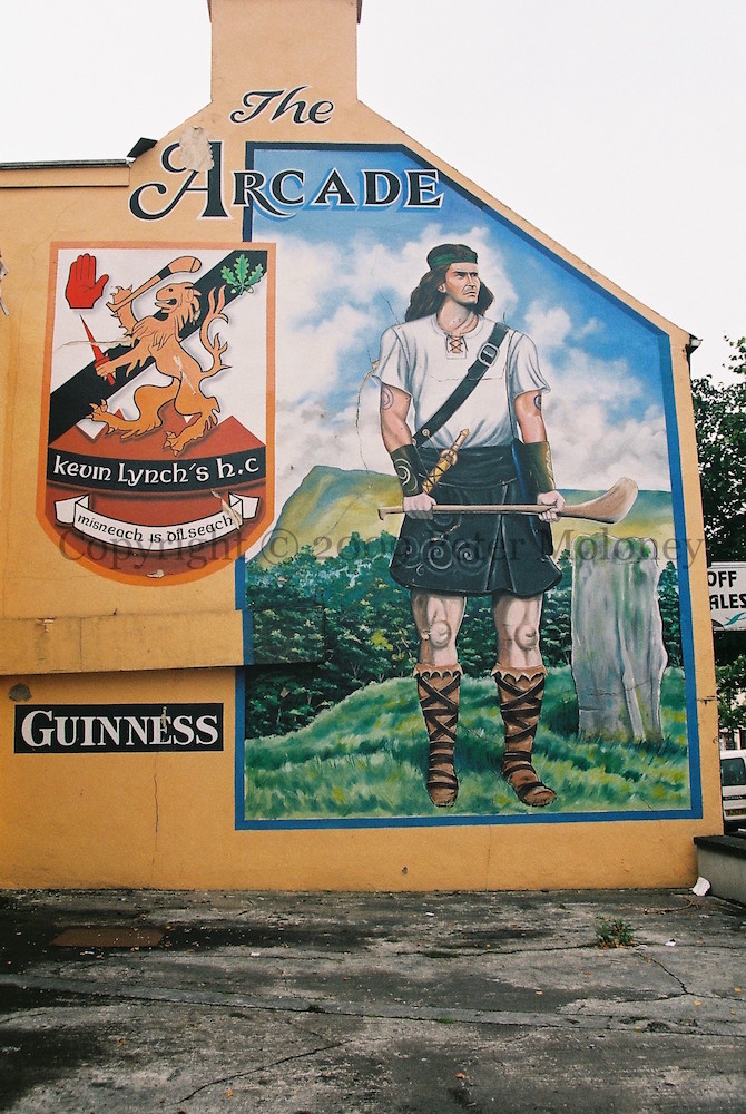 Kevin Lynch captained the Derry Under-16 hurling team to an All-Ireland trophy (see X02866). The hurling half of the local Dungiven CLG was renamed in his honour after the INLA volunteer died after 71 days on hunger strike in 1981. “Mısneach ‘s dılseach” [Courageous and loyal]. Lynch is shown here in a setting of ancient Ireland, reminiscent of Setanta/Cú Chulaınn.