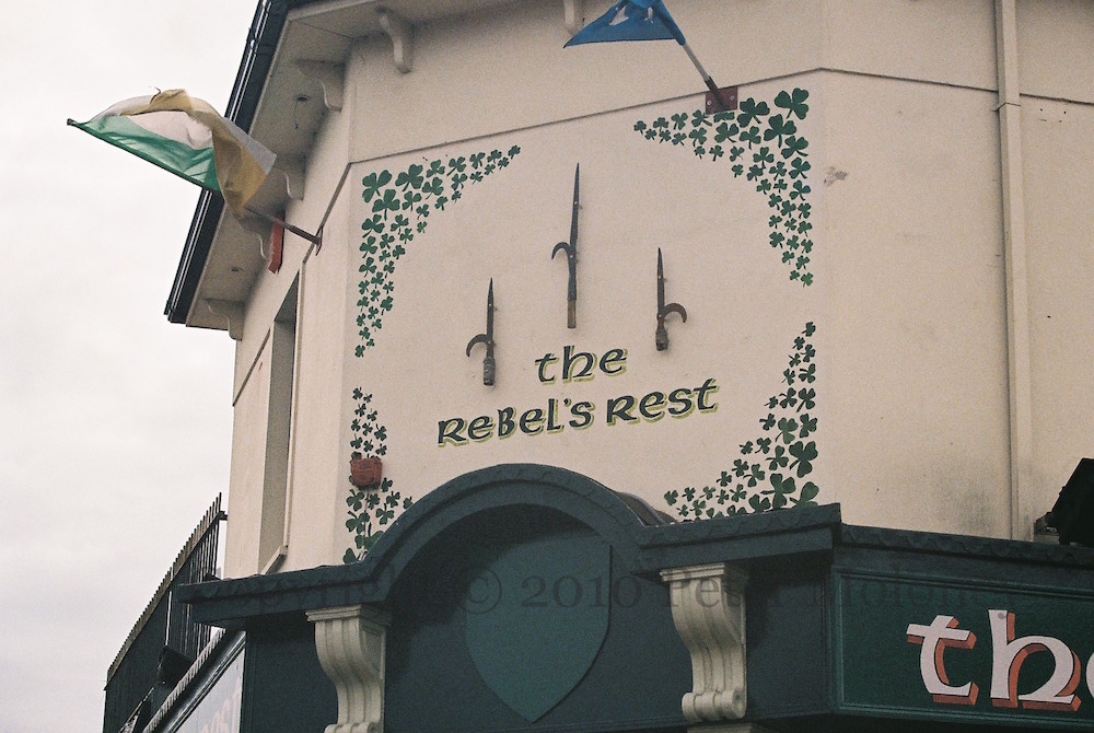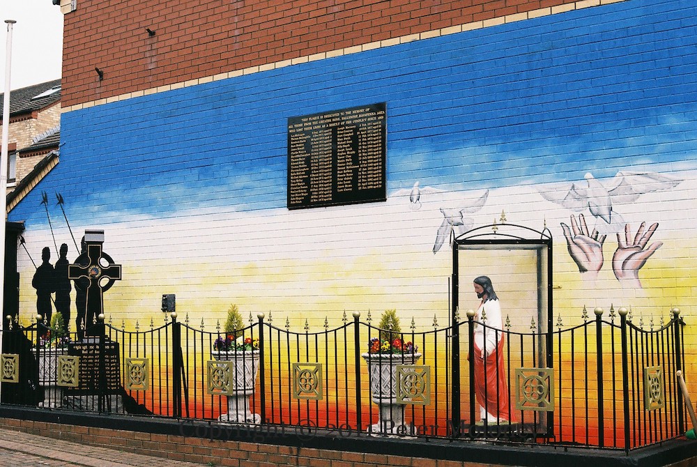 “In proud memory of Vol. Bobby Sands MP Óglaıgh Na hÉıreann. Elected by the people of this constituency 9th April 1981. Died after 66 days on hungerstrike 5th May 1981. ‘I’ll wear no convict’s uniform/Nor meekly serve my time/That Britain might brand Ireland’s fight/Eight hundred years of crime’. Fuaır sé bás ar son saoırse muıntır na hÉıreann.”