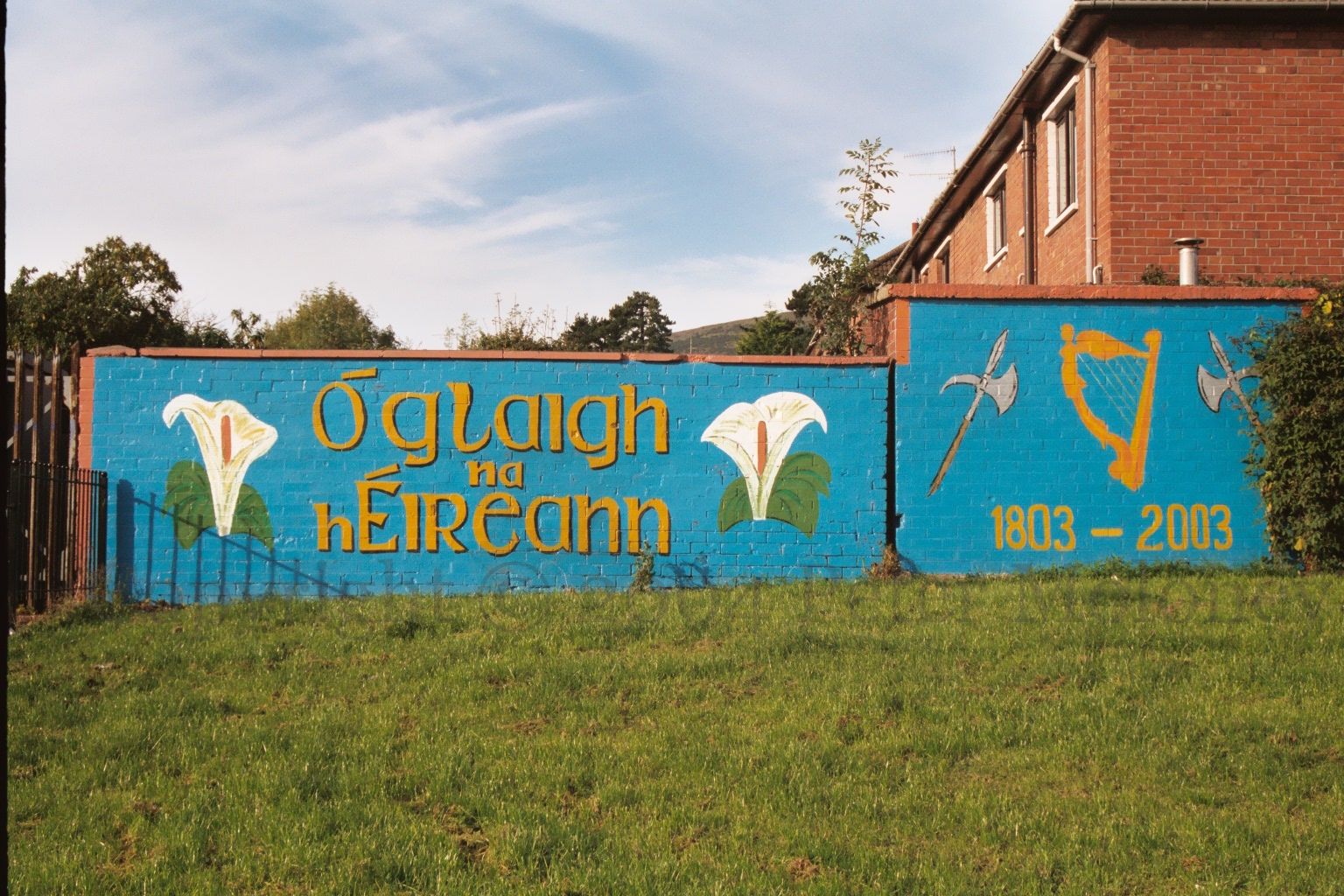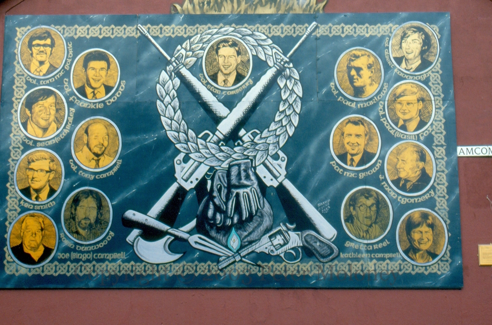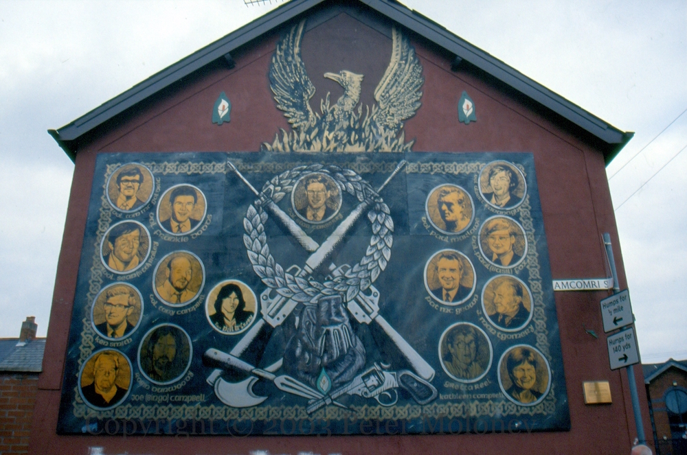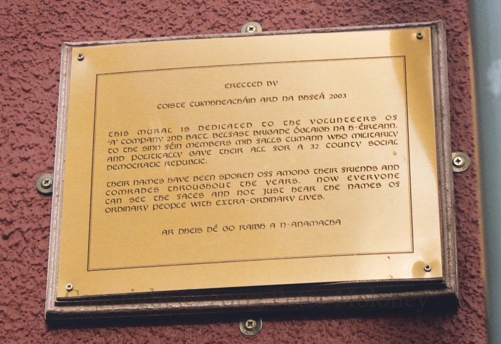 “Erected by Coıste Cuımhneacháın Ard Na bhFeá 2003.” The plaque reads, “This mural is dedicated to the volunteers of ‘A’ company 2nd batt. Belfast Brigade Óglaıgh na hÉıreann, to the Sınn Féın members Mid Falls cumann, who militarily and politically gave their all for a 32 county social democratic republic. Their names have been spoken off [sic] among their friends and comrades throughout the years. Now everyone can see the faces and not just hear the names of the ordinary people with extra-ordinary lives.”