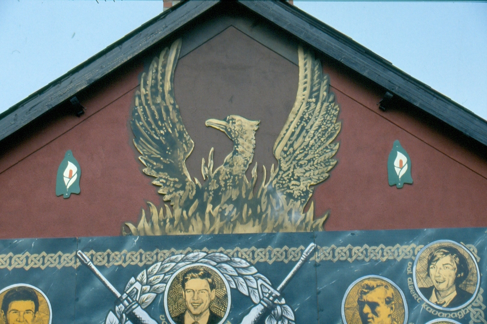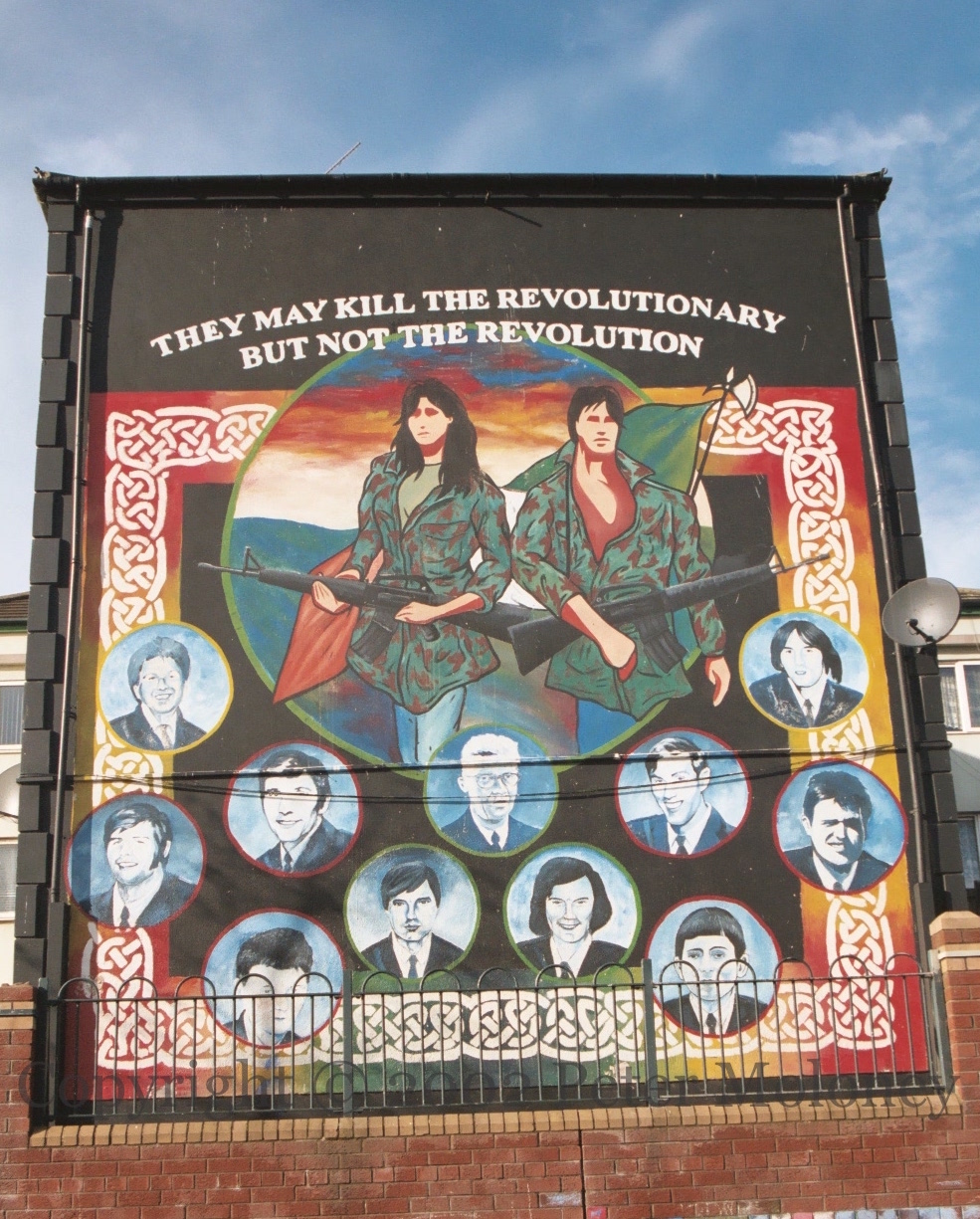 “They may kill the revolutionary but not the revolution.” The imagery of the open-throated volunteers goes back to a 1981 poster. The 11 portraits are perhaps those of the people listed on the roll of honour at Constance Markievicz House, a short distance away: Martin Skillen, Gerard Fennell, Sean McDermott, Paul Best, Pearse Jordan, Terence O’Neill, John Dempsey, Martin Forsythe, Tom Magill, Sean Savage. Kevin McCracken.