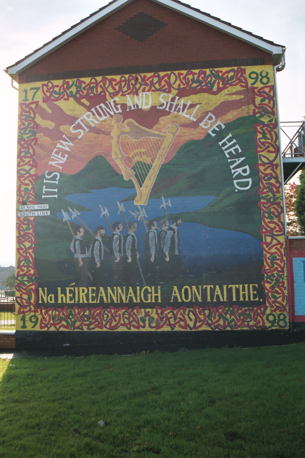 Andrea Redmond painted this mural in South Link, Andersonstown, Belfast, for the 200th anniversary of the 1798 rebellion by Na hÉıreannaıgh Aontaıthe (the United Irishmen). This style of harp is called a Maid Of Erin harp.