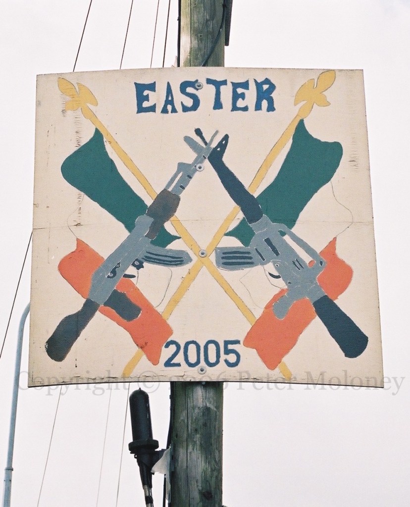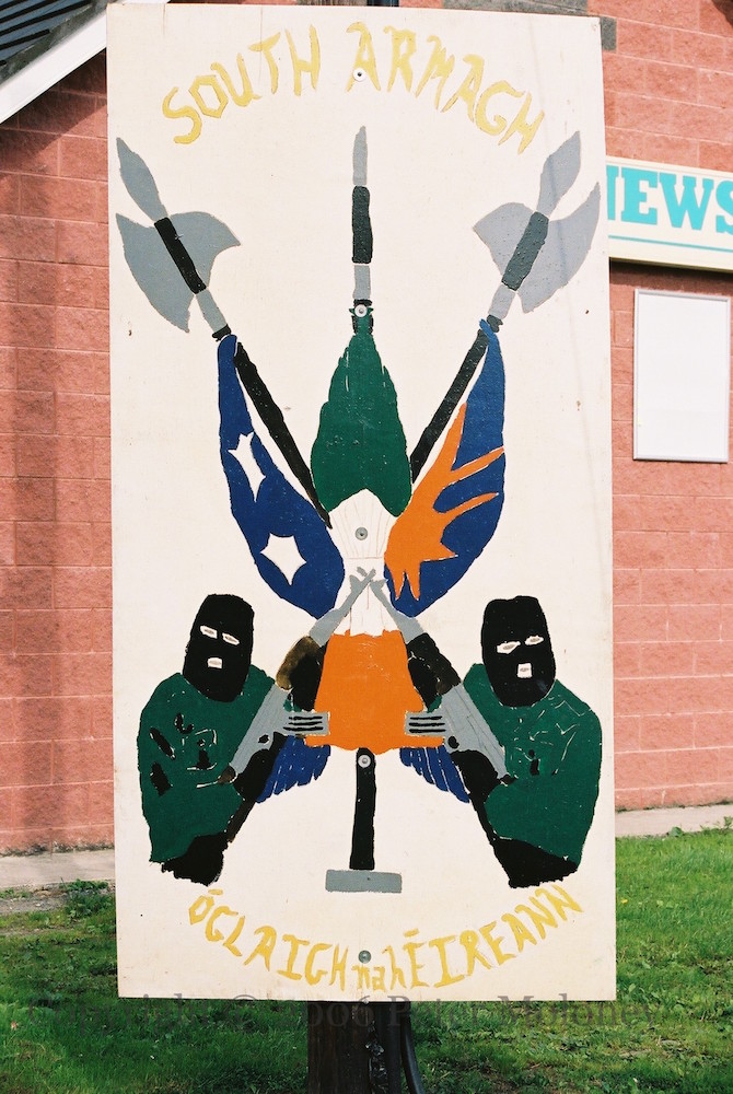 Here are three nail-ups from Newry Road, Crossmaglen. The first shows hooded IRA volunteers in front of Starry Plough and Sunburst flags on pikes (symbol of the 1798 Rebellion). The second shows crossed pikes and crossed rifles. The third calls for British Army bases to be demilitarised.