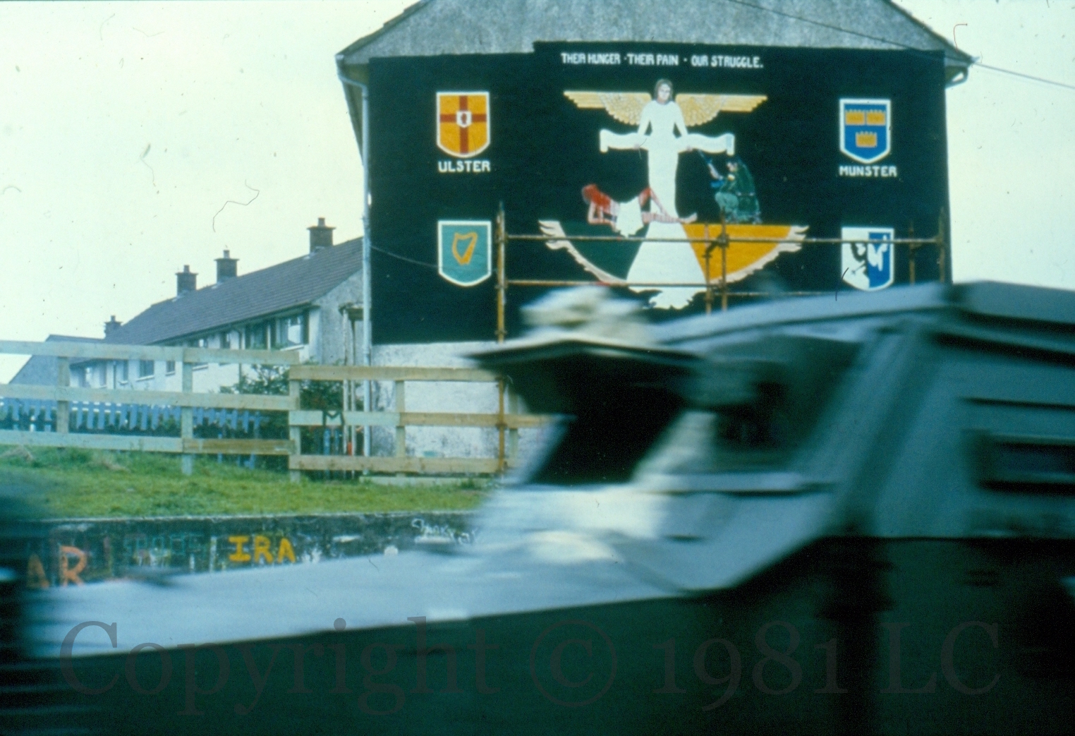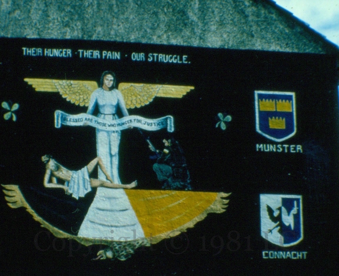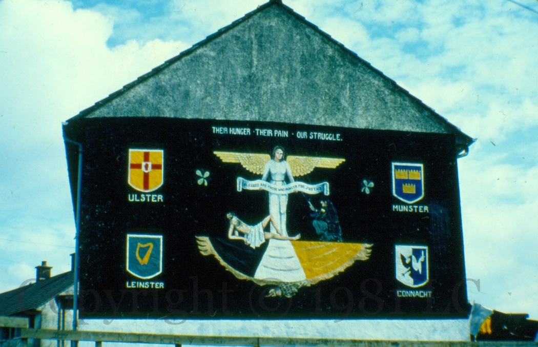 Republican prisoners, one with a raised fist: “I’ll wear no convicts uniform, nor meekly serve my time, that Britain might make Ireland’s fight 800 years of crime.” It appears – from the fist in the top of the gable – that a larger version was initially attempted but then scaled back; the figures are based on two posters from the era.
