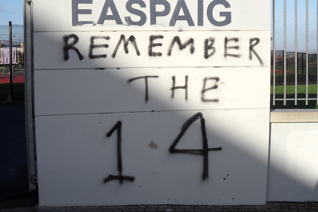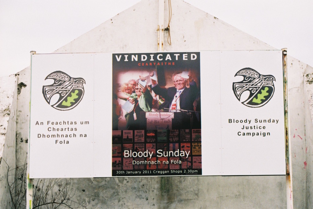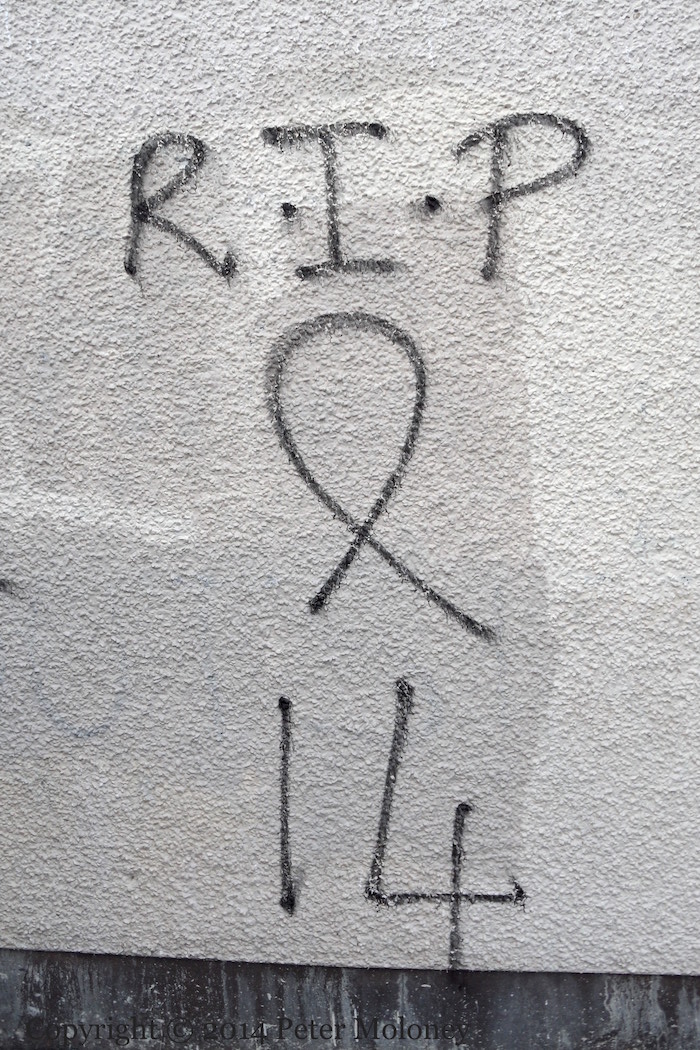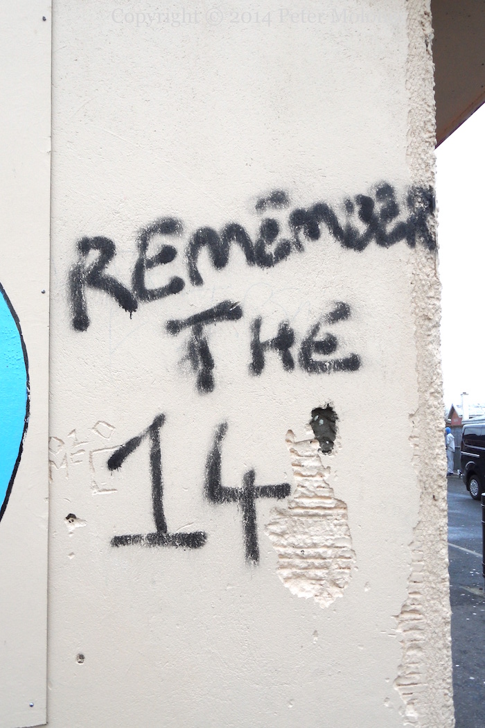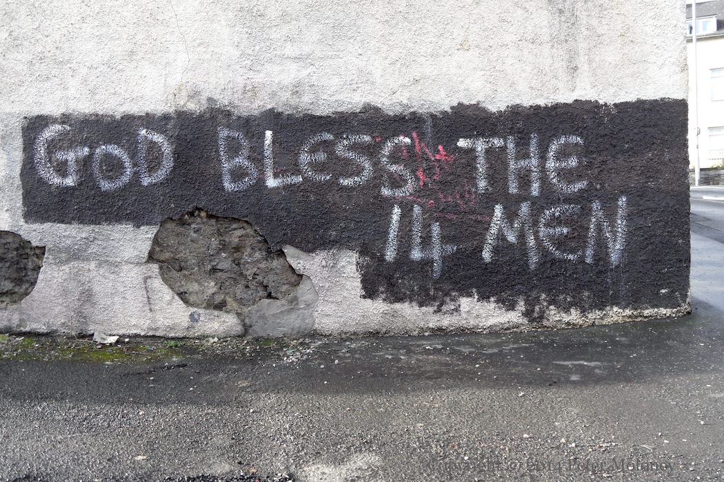 This is a repainted version of the Bloody Sunday mural in Westland Street, now with a purple background and white leaves. The Christian cross in the centre was absent from the original version of the mural, and added to the version painted in 2005.