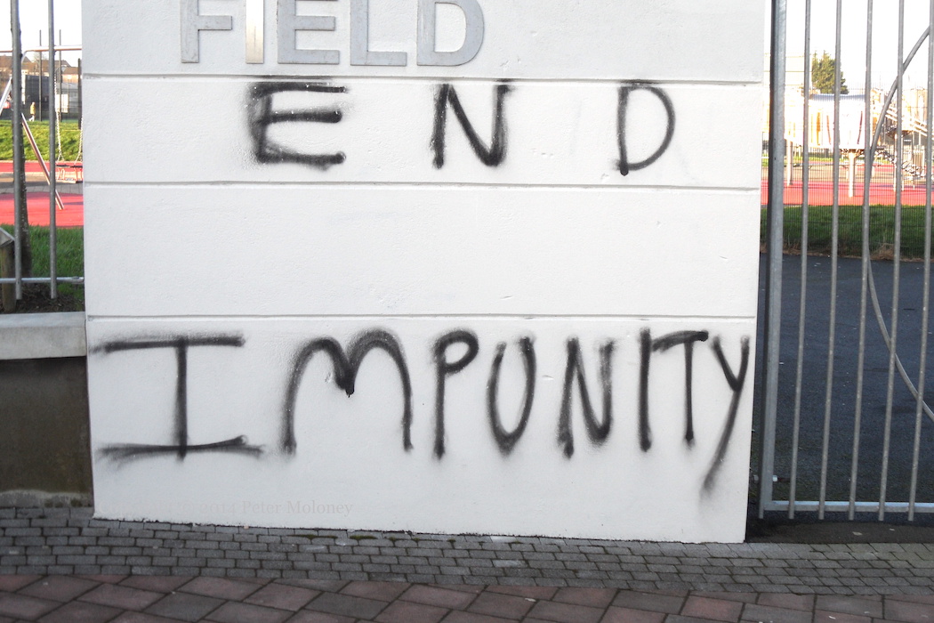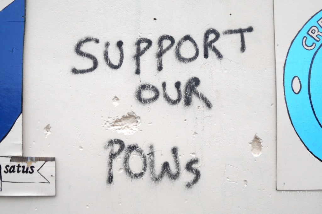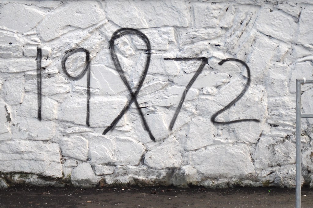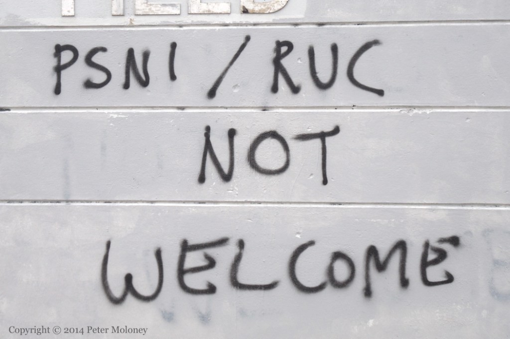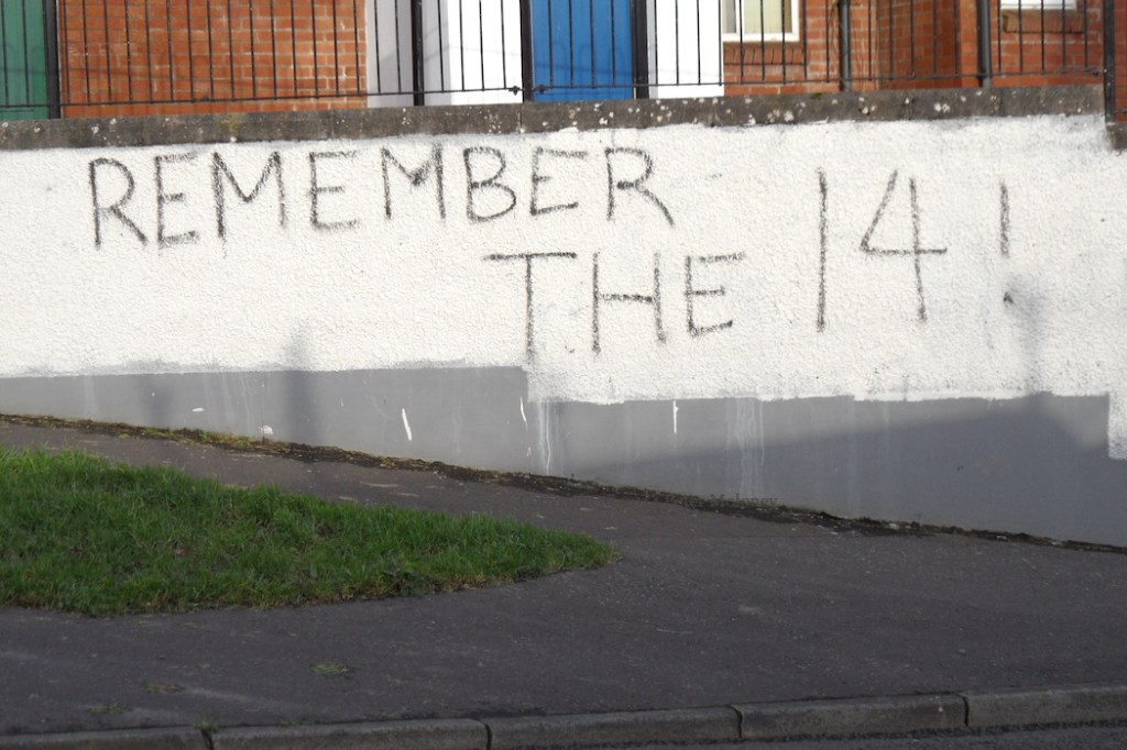 This is a repainted version of the Bloody Sunday mural in Westland Street, now with a purple background and white leaves. The Christian cross in the centre was absent from the original version of the mural, and added to the version painted in 2005.