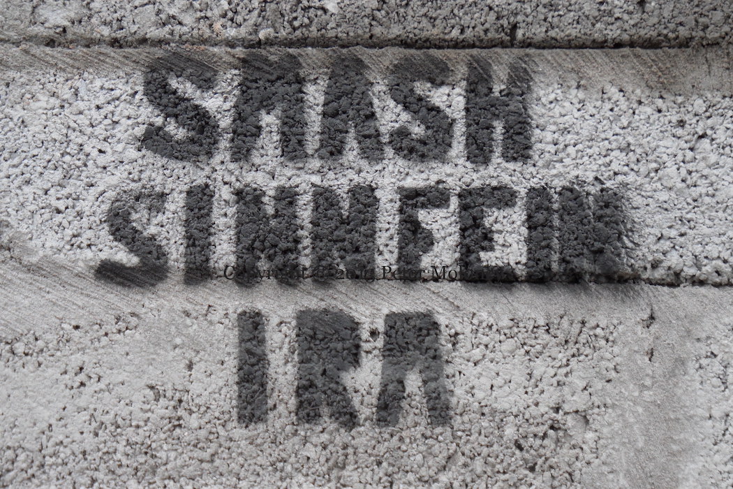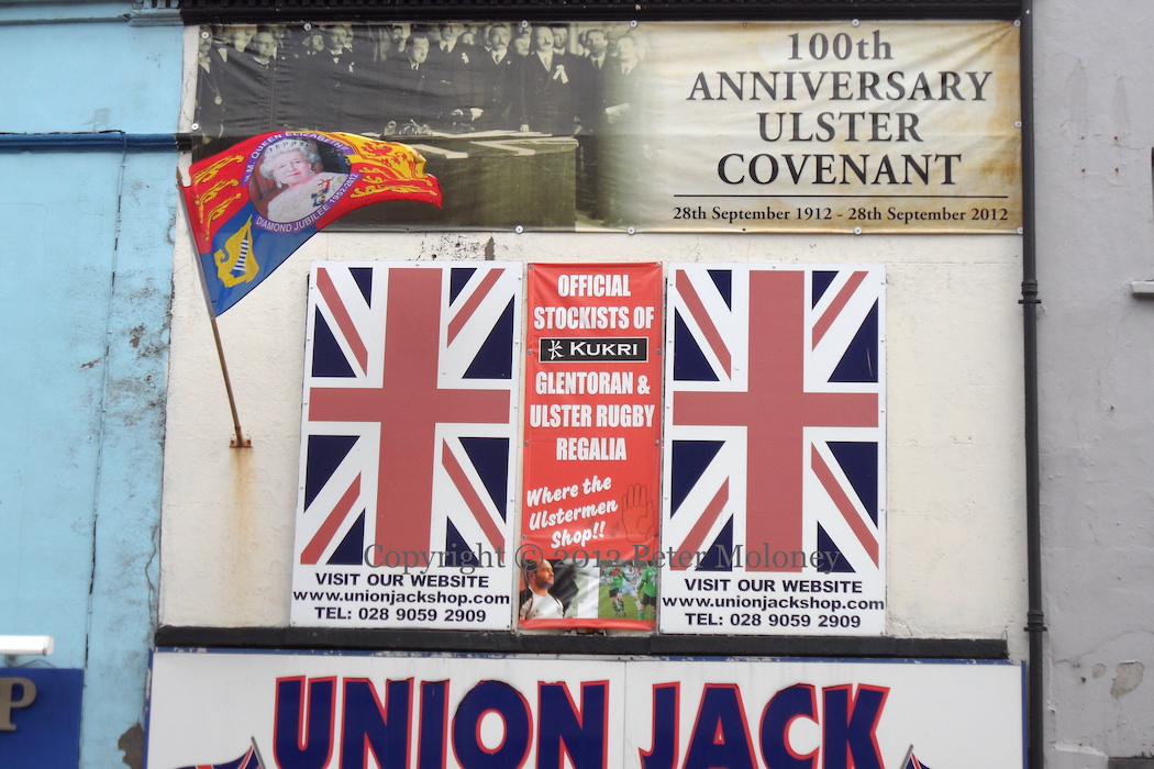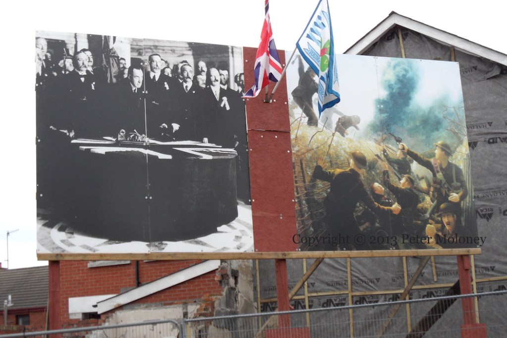 The mural above uses the text of the Ulster Covenant, signed in September, 1912, as a backdrop to a composite of Edward Carson speaking and a row of Ulster Volunteers, formed in January 1913. (See Extramural Activity for the source photos.)