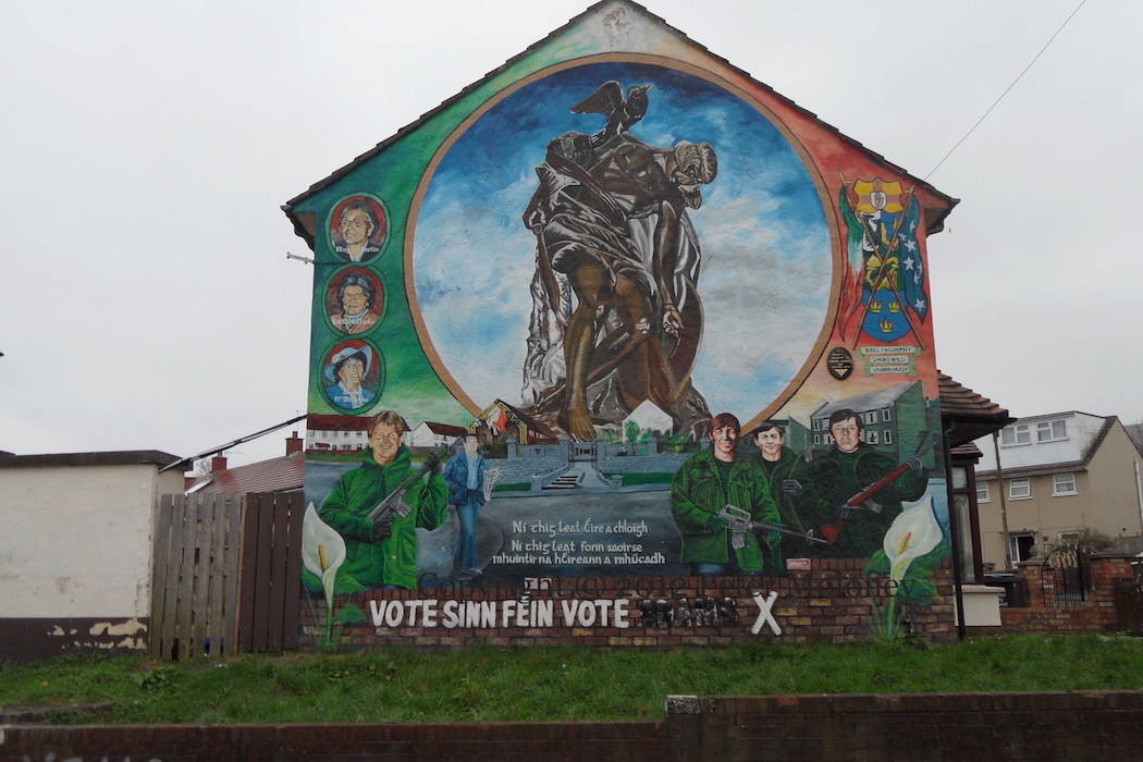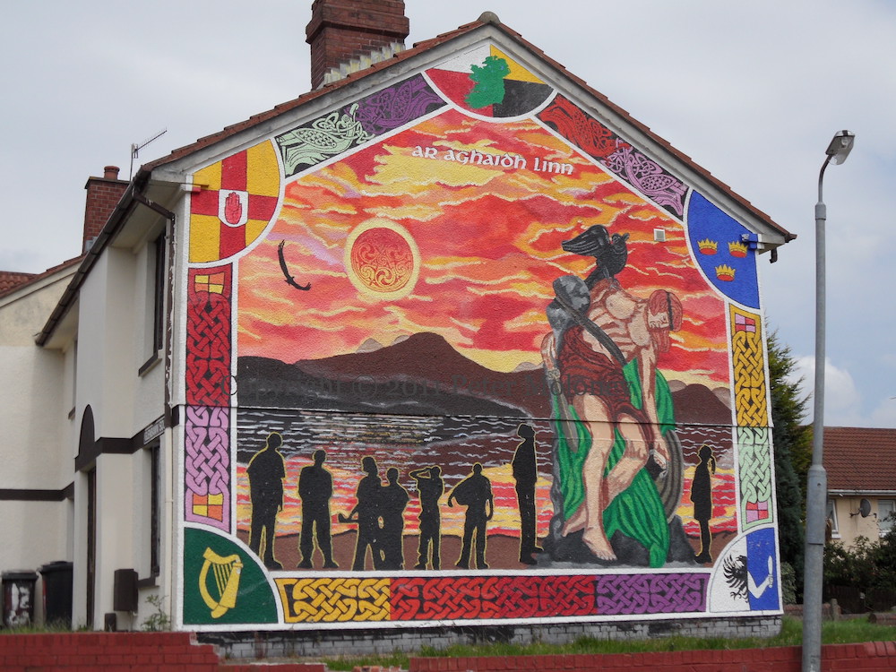 “Cuımhnímıs [we remember].” The mural to the “patriot dead” of Lenadoon who died for the freedom (“saoırse”) of Ireland has been repainted.