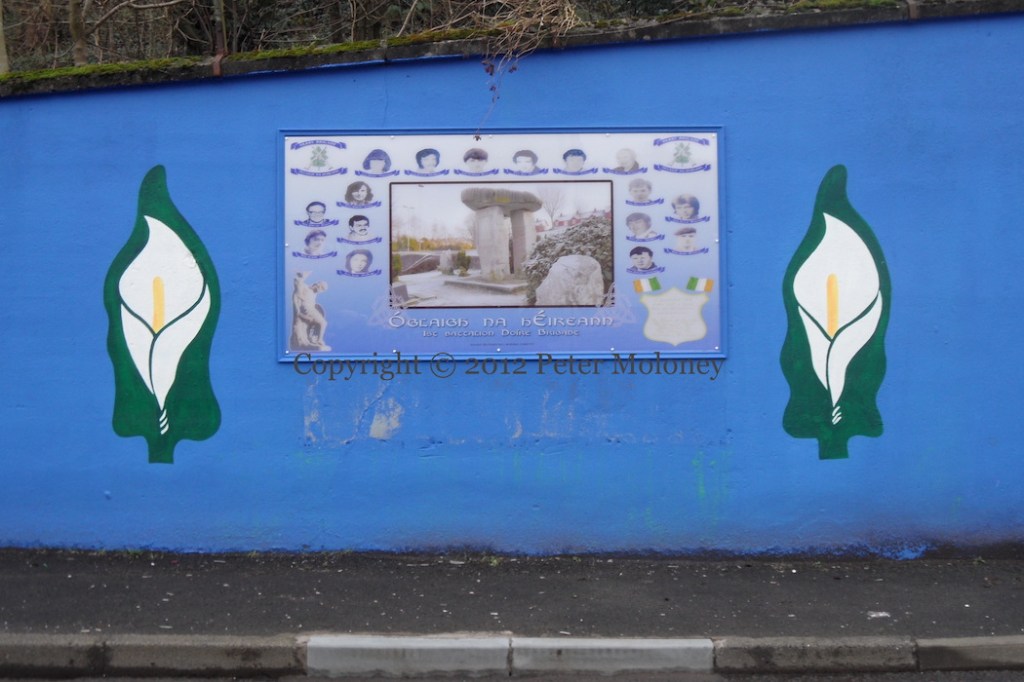 The design and central figure remain as before, but the tricoloured border is new, as are the photographic portraits of nine local IRA volunteers in the apex. On the scrolls to each side, their names are given as (left) Tony Henderson, John Finucane, Tony Jordan, Brendan O’Callaghan, Joe McDonnell, (right) Laura Crawford, Maıréad Farrell, Patricia Black, Bridie Quinn.