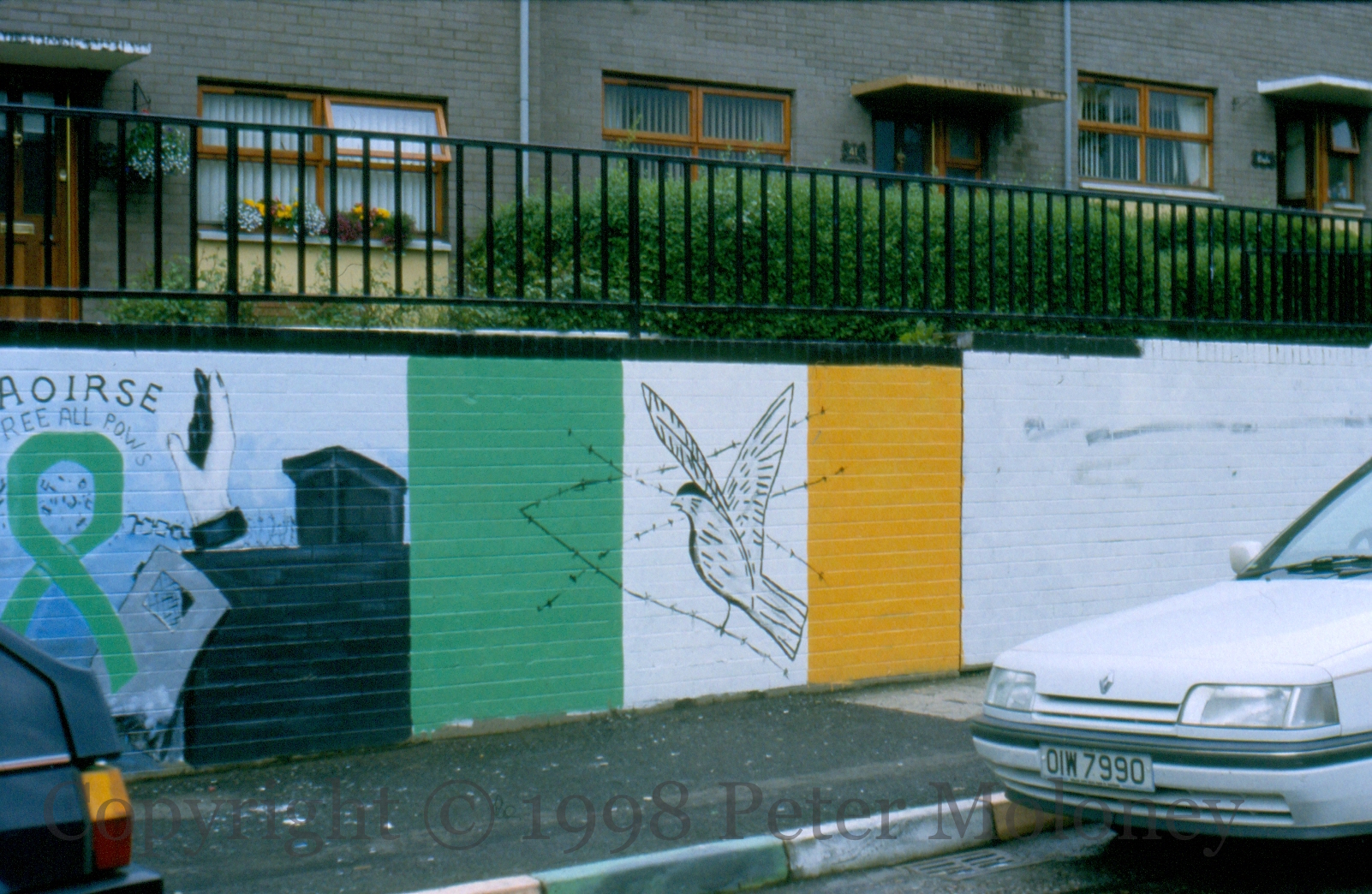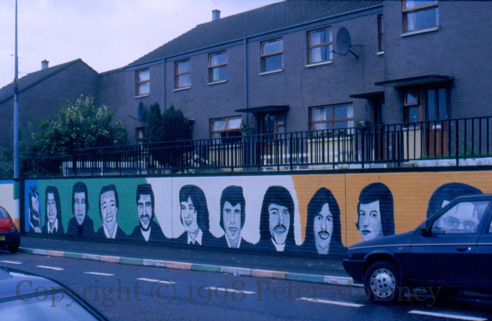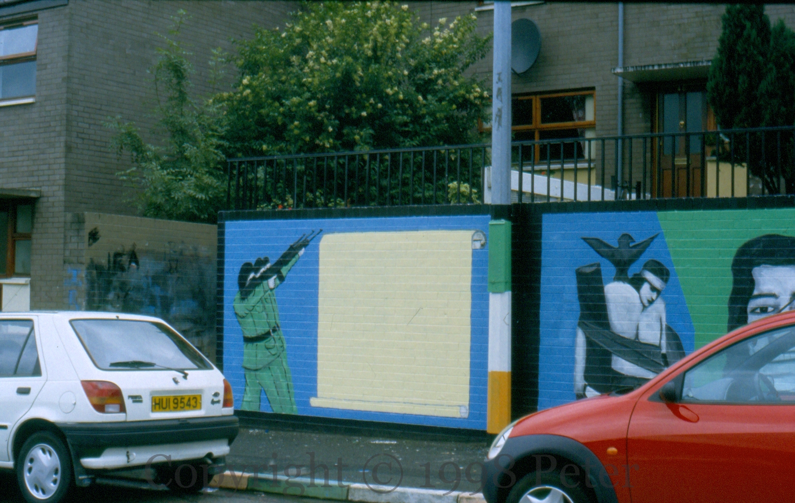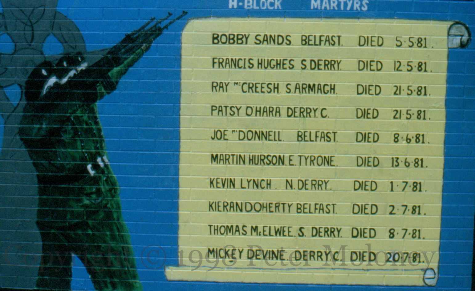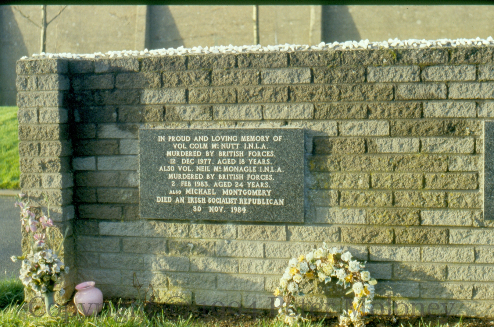 These are close-ups of the IRA memorial in Derry’s City Cemetery (“Erected Easter 1975”, with the roll of honour extended around the base and then onto additional stones, and a plaque added in 1991 on the 75th anniversary of the second hunger strike and seen first in 1994). “Arna tógáıl An Cháısc 1975, ag Brıogáıd Dhoıre, Óglaıgh Na hÉıreann ın ómós agus ı gcuımhne ár gcomrádaıthe a rınne a ardíobaırt go saortar ár dtír dhúchaıs.”