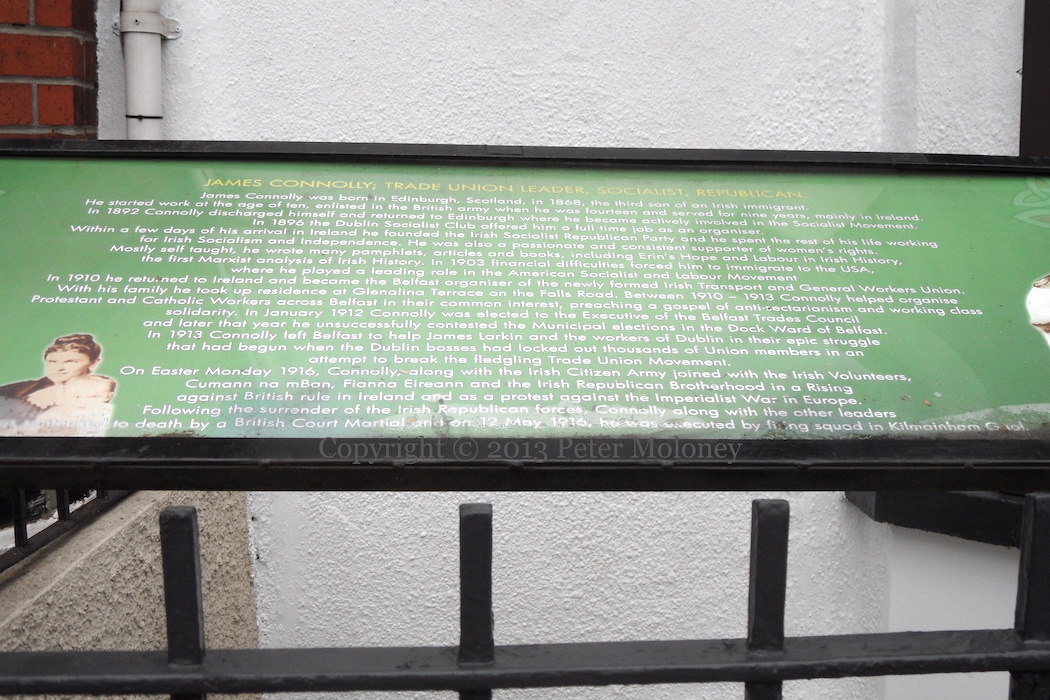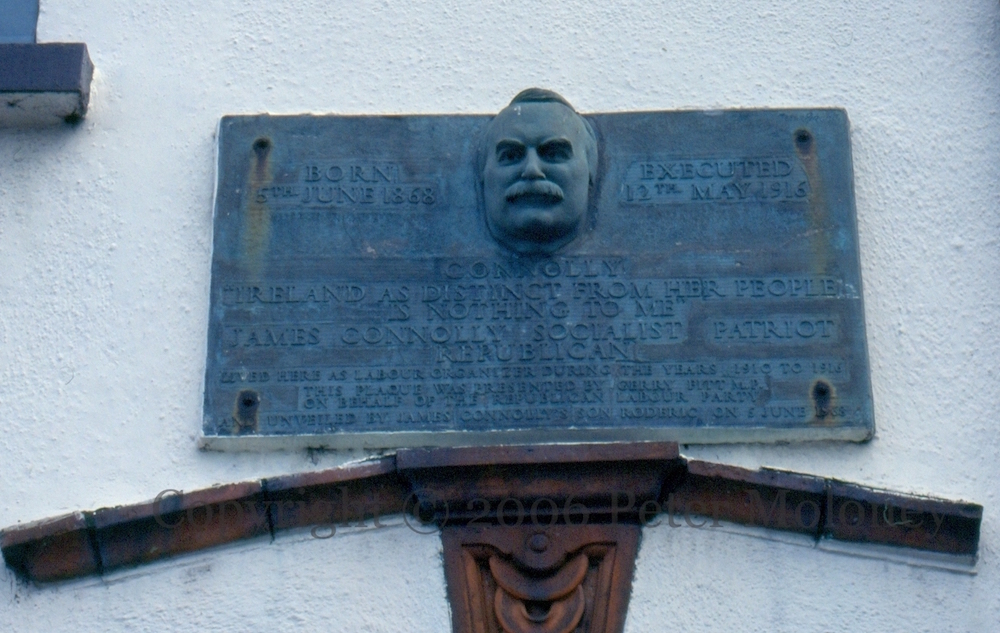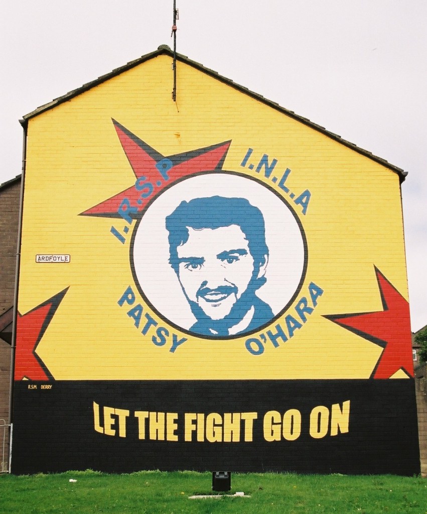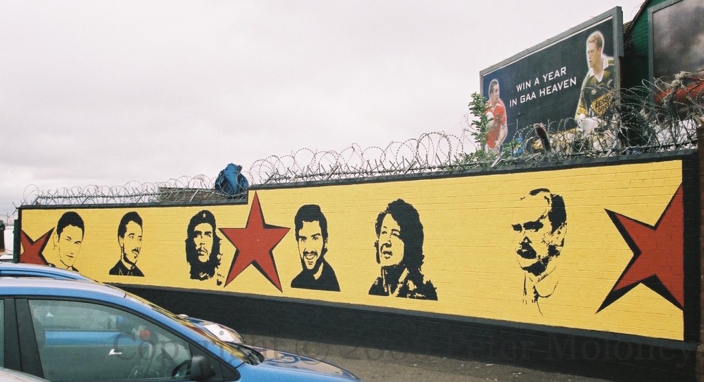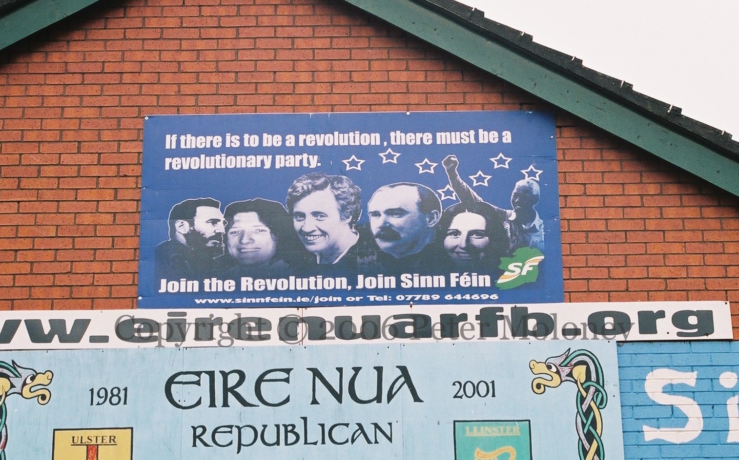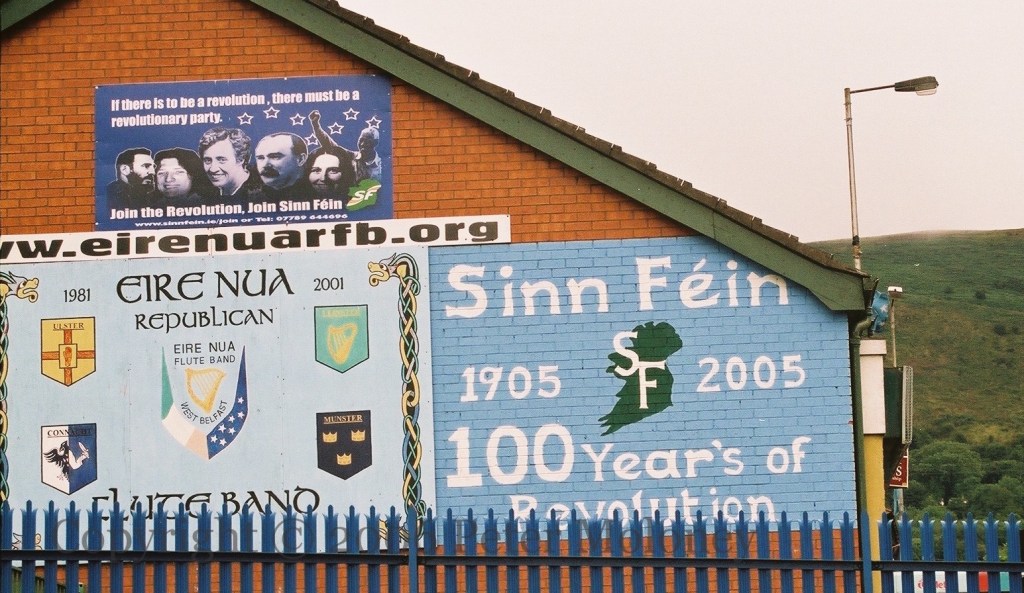 A Sınn Féın centenary (1905-2005) mural is added to the Éıre Nua Flute Band board (seen in 2004). Above them is a Sınn Féın board with Mao’s statement that “If there is to be a revolution, there must be a revolutionary party.” Both the flute band and Sınn Féın have internet addresses.