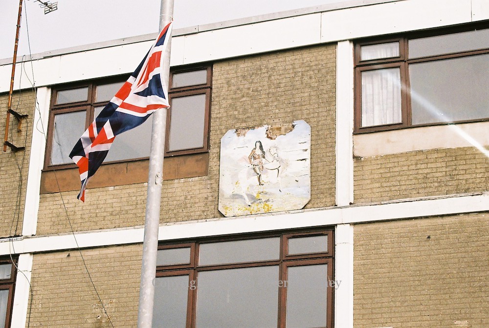 The King Billy mural in Ballycarry is updated (see J1608): the King looks left (towards ‘Scotland’), his horse walks on water, and the background changes from red to black.