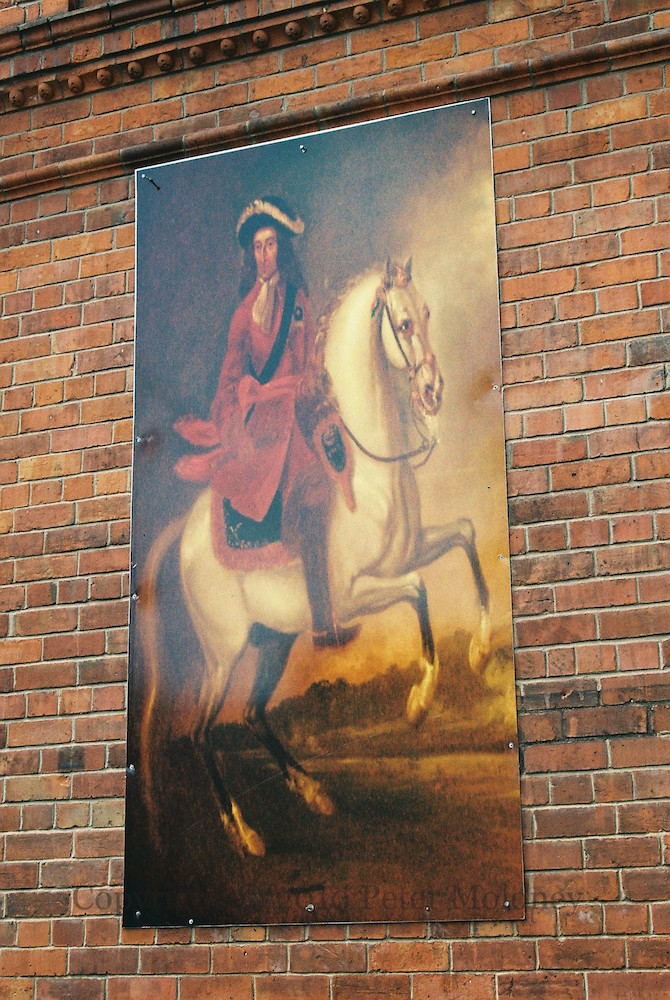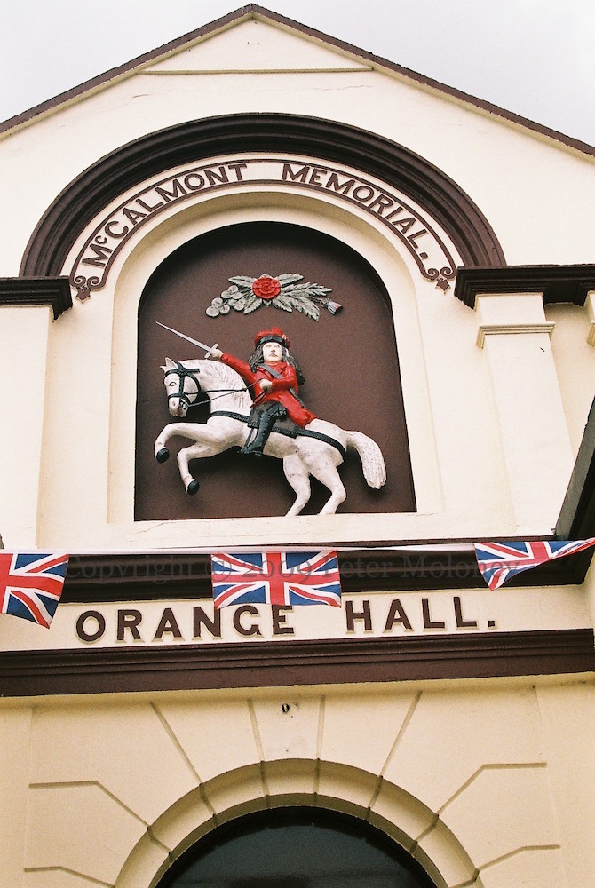 Images of the Somme and of ERII flank the traditional image of King William at the Boyne in the Orange arch on My Lady’s Road, Belfast. (The small tarps are sponsored by the East Belfast Historical And Cultural Society and the Lagan Village Cultural Society.) On top are the holy Bible and the crown, with the ladder and the star to either side.