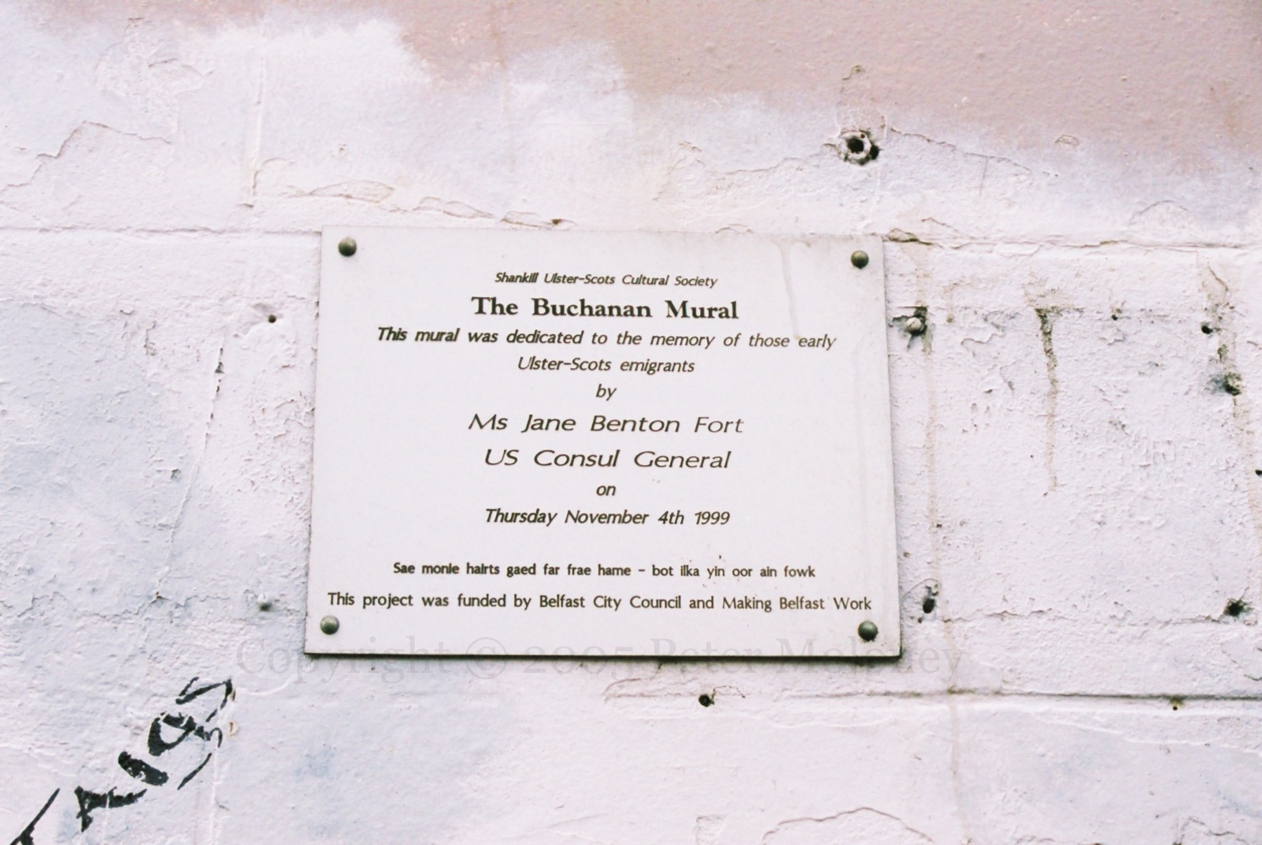 “Shankill Ulster-Scots Cultural Society. The Buchanan Mural. This mural was dedicated to the memory of those early Ulster-Scots emigrants by Ms Jane Benton Fort, US Consul General, on Thursday November 4th, 1999. Sae monie hairts gaed far frae hame – bot ilka yin oor ain fowk. This project was funded by Belfast City Council and Making Belfast Work.”