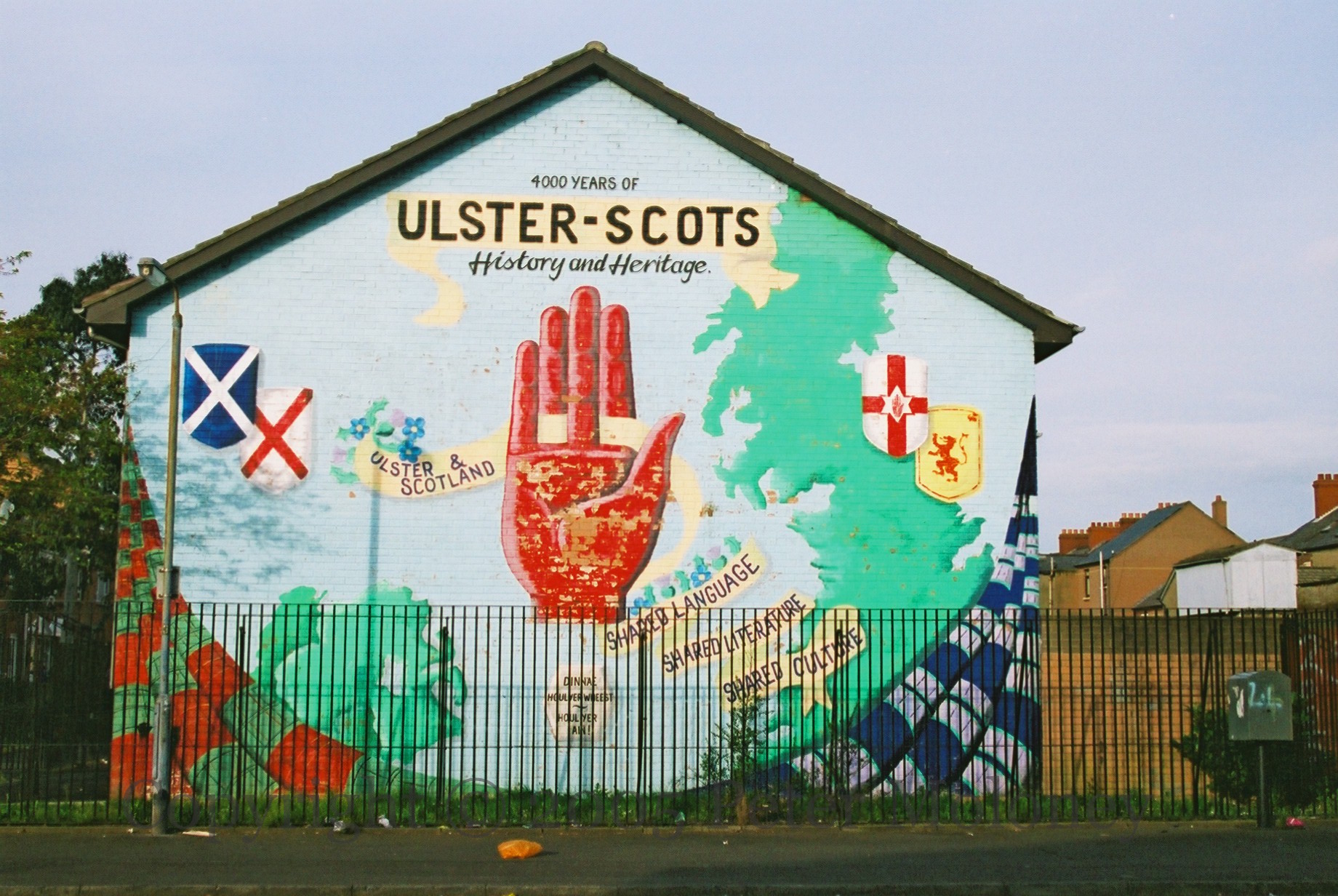 Ulster-Scots was included in the 1998 Good Friday Agreement under the principle of support for “linguistic diversity”. This mural celebrating Ulster-Scots and ties between Northern Ireland and Scotland dates to 1999, with the crests of St Andrew and St Patrick on the left, and an Ulster Banner and Scottish lion rampant on the right.