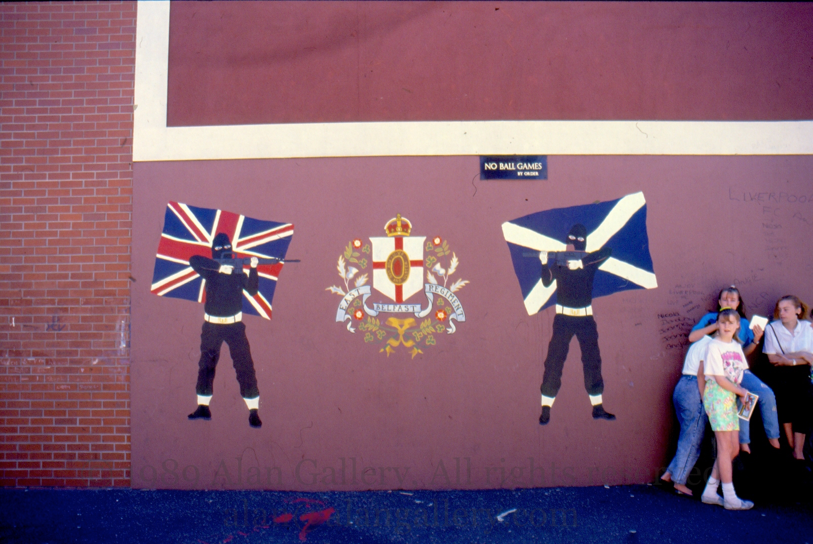 An ornate regimental (WWI) coat of arms, for the East Belfast regiment, with the emblem of the Ulster Volunteers symbol on an Ulster banner shield, topped by a crown and surrounded by an arrangement of roses, thistles, and shamrock. “Contemporised” by masked volunteers with weapons pointed, in front of Union flag and St Andrew’s Saltire. Chelsea Street, Belfast