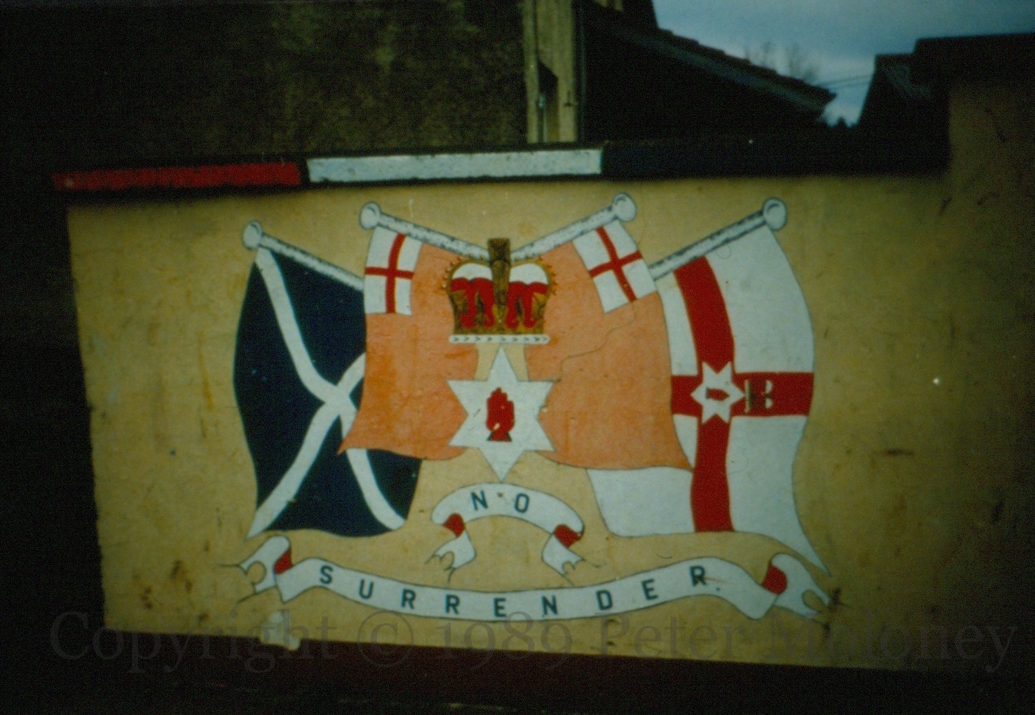 Ulster-Scots was included in the 1998 Good Friday Agreement under the principle of support for “linguistic diversity”. This mural celebrating Ulster-Scots and ties between Northern Ireland and Scotland dates to 1999, with the crests of St Andrew and St Patrick on the left, and an Ulster Banner and Scottish lion rampant on the right.