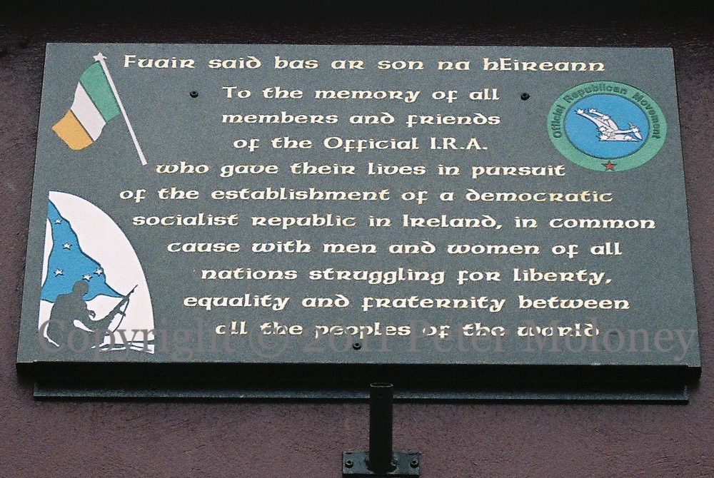 Commemorating “one hundred years of resistance” (1909-2009) in Berwick Road, Ardoyne: a plaque to Fıanna Davy McAuley, Josh Campbell, Josie McComiskey, and Bernard Fox, all of whom died in 1972. “You may kill the revolutionary, but never the revolution.” “Dedicated by the Republican Network For Unity.”
