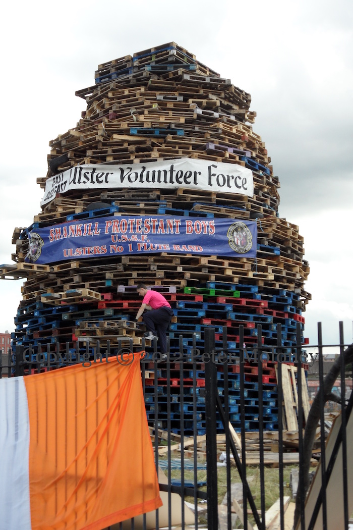 Two PUL banners are added to the internment bonfire in Divis: the upper one says “East Belfast Ulster Volunteer Force”, while the latter reads “Shankill Protestant Boys [Fb] USSF Ulsters No 1 flute band.” On the top is a Drumcree Orange Order flag: “Civil and religious liberty”; “Here we stand, we can do no other”.