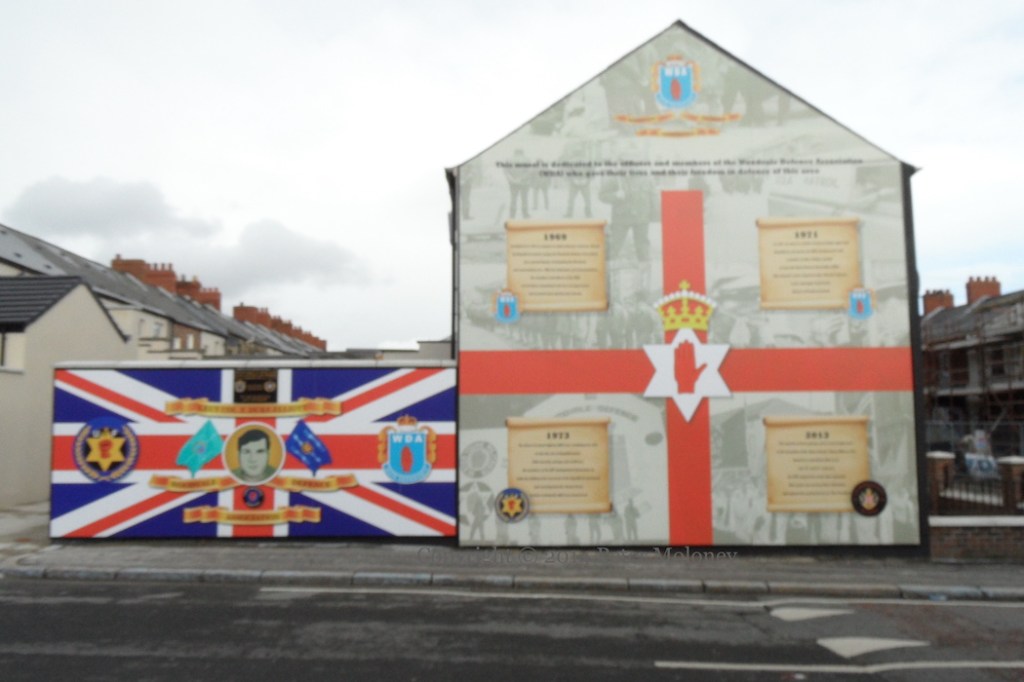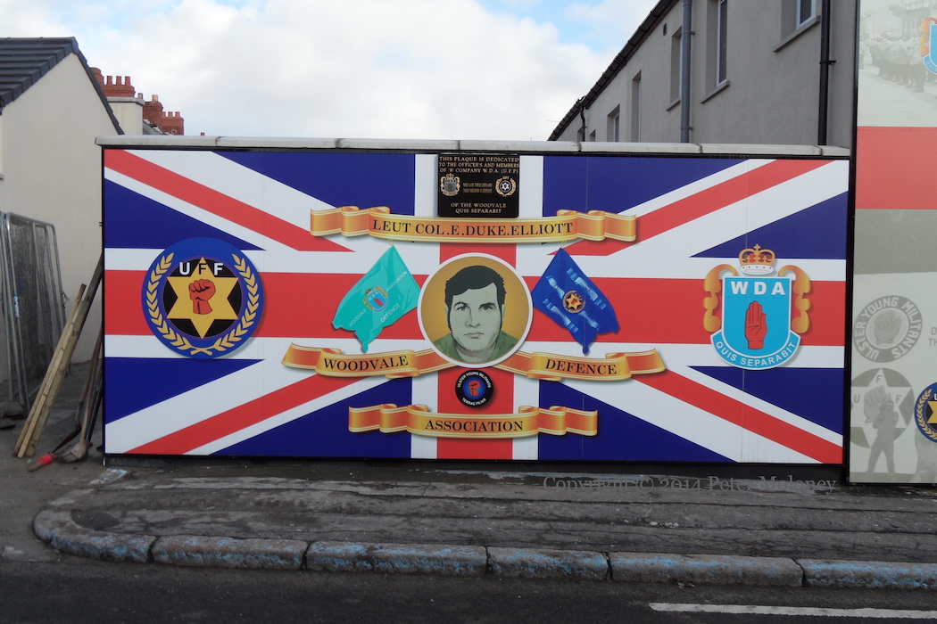The gable wall at the end of Columbia Street (on Ohio Street) has been rebuilt and the old WDA/Duke Elliott mural has been replaced. The right side of the piece describes the transition from the Woodvale Defence Association to the Ulster Defence Association to the Ulster Freedom Fighters, and grounds all three in the Ulster Defence union of 1893. Ernie “Duke” Elliott was killed in 1972, at age 28, in a dispute with other UDA members; he lived one street over from the site of these new boards, in Leopold Street (WP).