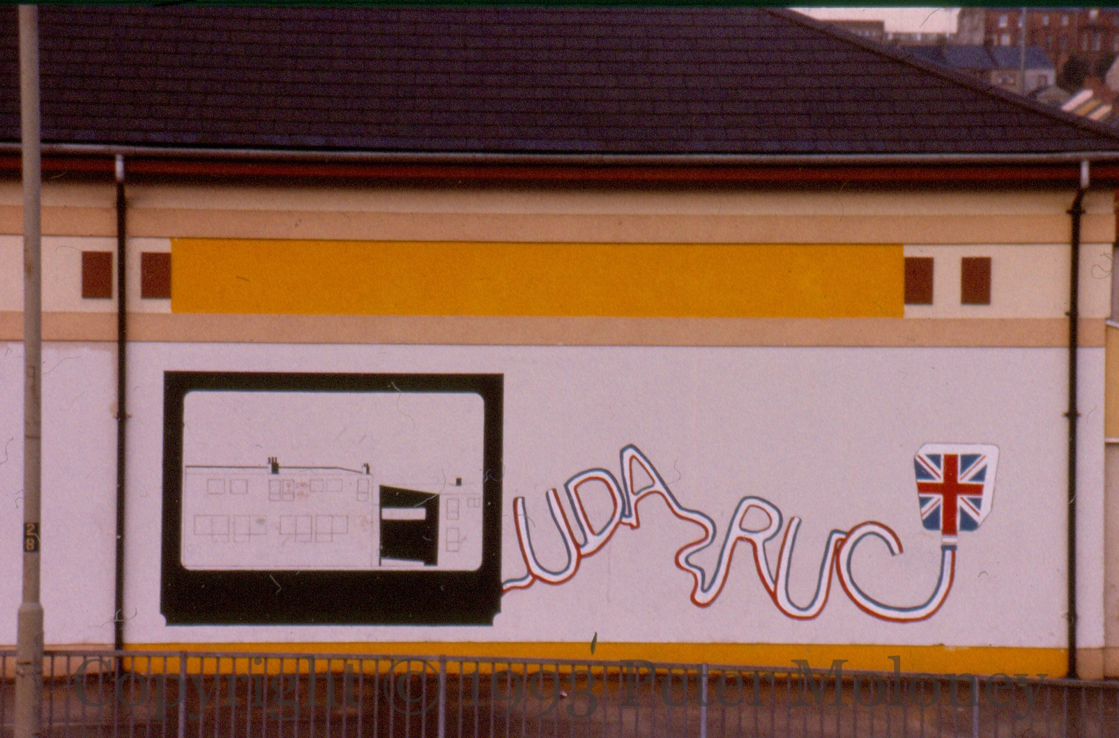 The YCV shamrock and a small board with the (unofficial) arms of the 36th (Ulster) Division, including a Union flag and harp above a red hand on a field of shamrocks. Crumlin Road, Belfast. Seen previously in 1988.