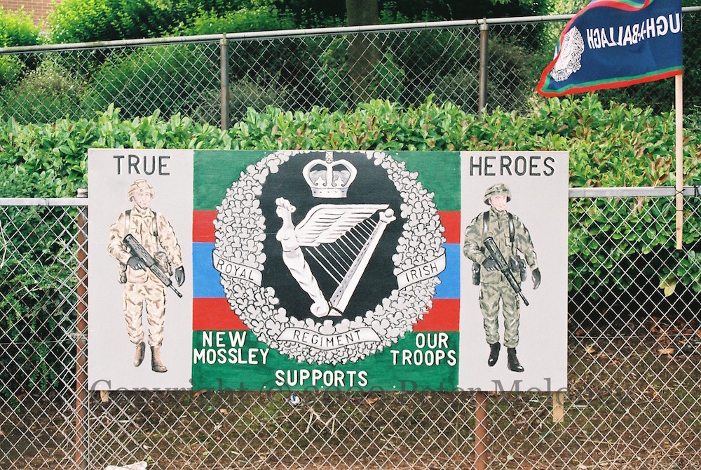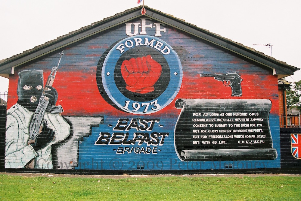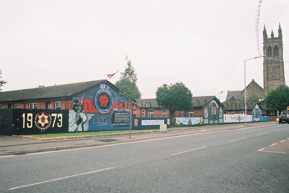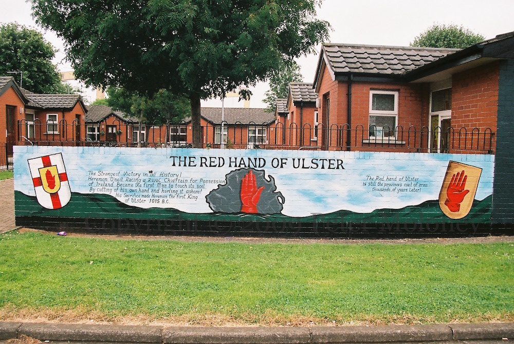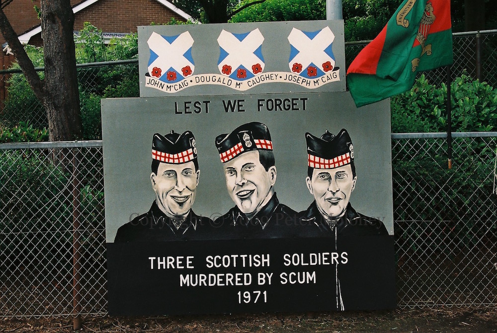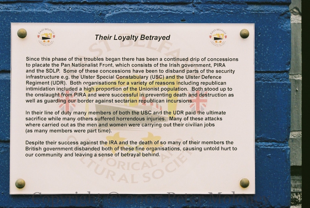 “This monument was erected by the republican people of greater Ballymurphy in proud and loving memory of all those volunteers from the area who gave their lives in the fight for Irish freedom.” Volunteers McParland, Kane, Maguire, Meehan, Sloan, McCormick, Campbell, Magee, Dougal, McCrudden, Clarke, Parker, Quigleey, Mulholland, O’Rawe, McGartland, Mulvenna, Pettigrew, Bryson, Teer, Stone, McGrillen, Tolan, McWilliams, Delaney, O’Neill, Jordan, Doyle, McCracken, McGeown. “Unveiled by Gerry Adams 12th May 1985. I ndıl cuımhne [chuımhne] i gcónaí ag na poblachtánaıgh ón cheantar Barr Cluanaí. Also in memory of the civilians who died at the hands of the British Army, RUC, UDR, and loyalist extremists.” The launch date of 1985 refers to the plaque’s former location in Glenalina Road (seen in 2001 and 2002).