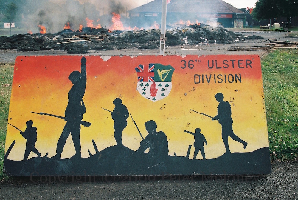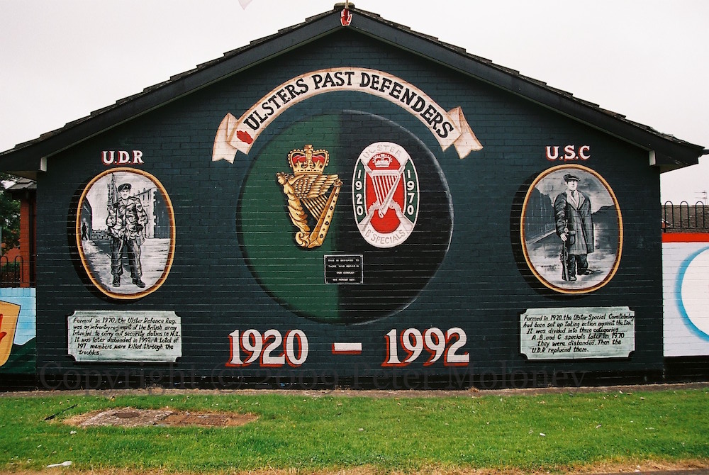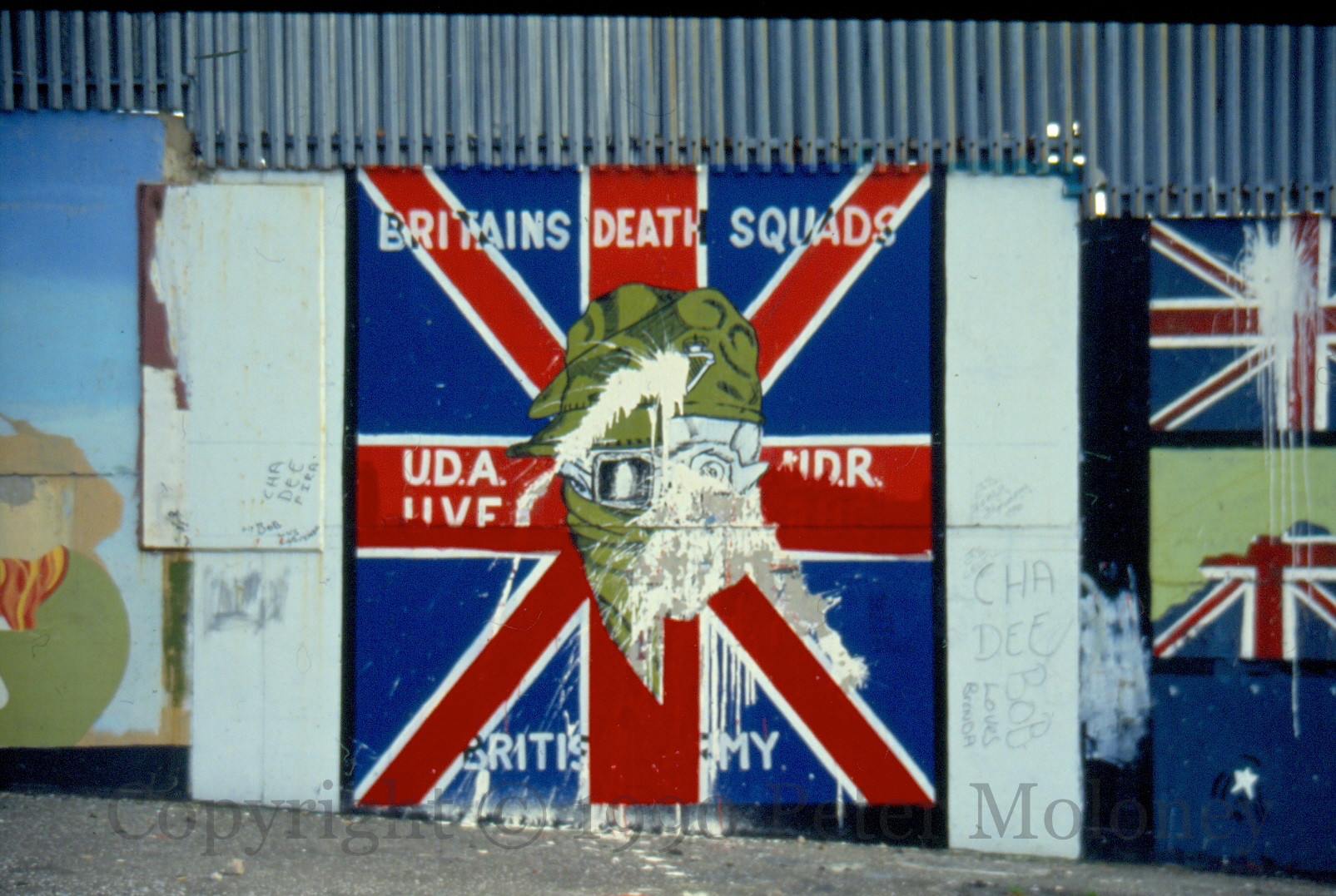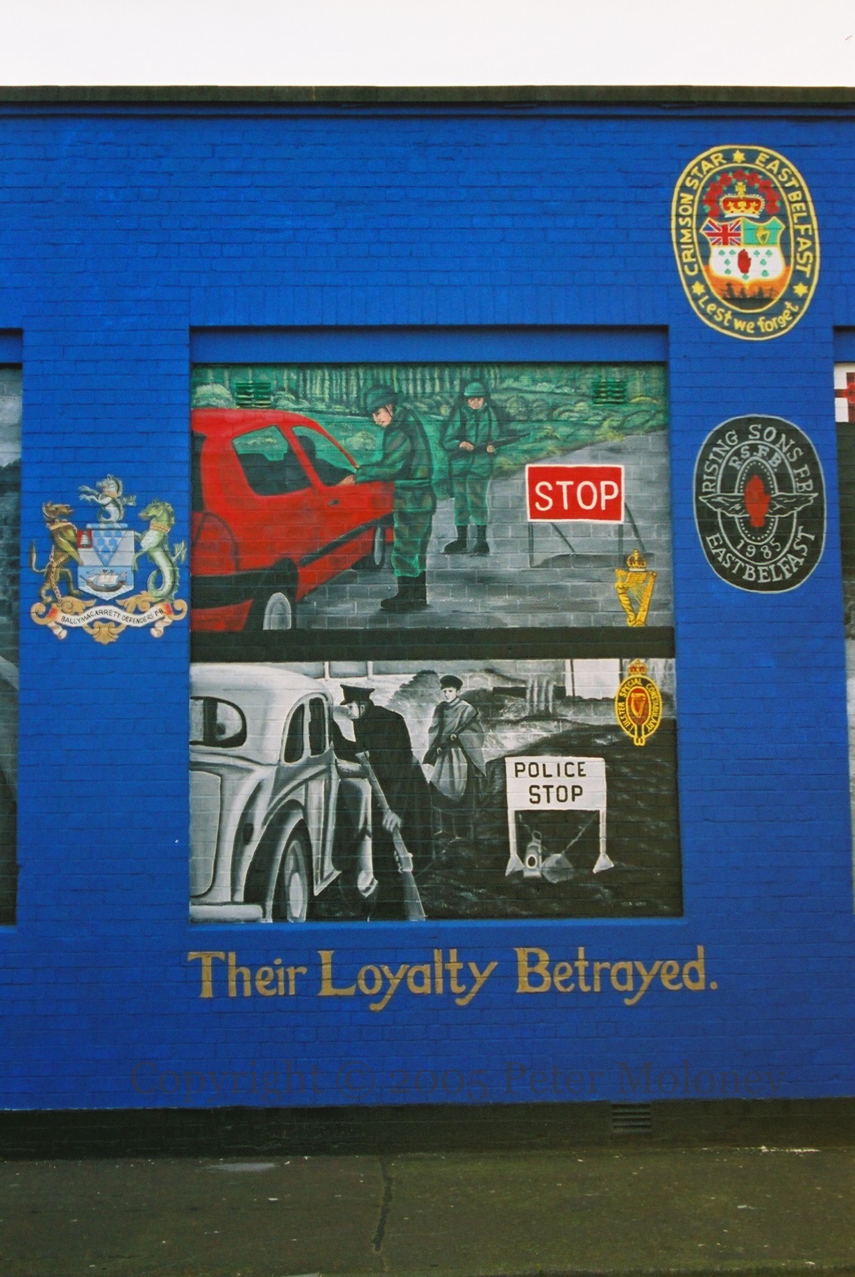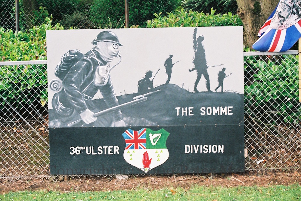 “This monument was erected by the republican people of greater Ballymurphy in proud and loving memory of all those volunteers from the area who gave their lives in the fight for Irish freedom.” Volunteers McParland, Kane, Maguire, Meehan, Sloan, McCormick, Campbell, Magee, Dougal, McCrudden, Clarke, Parker, Quigleey, Mulholland, O’Rawe, McGartland, Mulvenna, Pettigrew, Bryson, Teer, Stone, McGrillen, Tolan, McWilliams, Delaney, O’Neill, Jordan, Doyle, McCracken, McGeown. “Unveiled by Gerry Adams 12th May 1985. I ndıl cuımhne [chuımhne] i gcónaí ag na poblachtánaıgh ón cheantar Barr Cluanaí. Also in memory of the civilians who died at the hands of the British Army, RUC, UDR, and loyalist extremists.” The launch date of 1985 refers to the plaque’s former location in Glenalina Road (seen in 2001 and 2002).