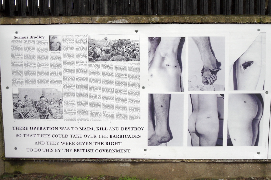 There was also a small installation of photographs and documents relating to Bradley’s killing below the Operation Motorman mural on Rossville Street.