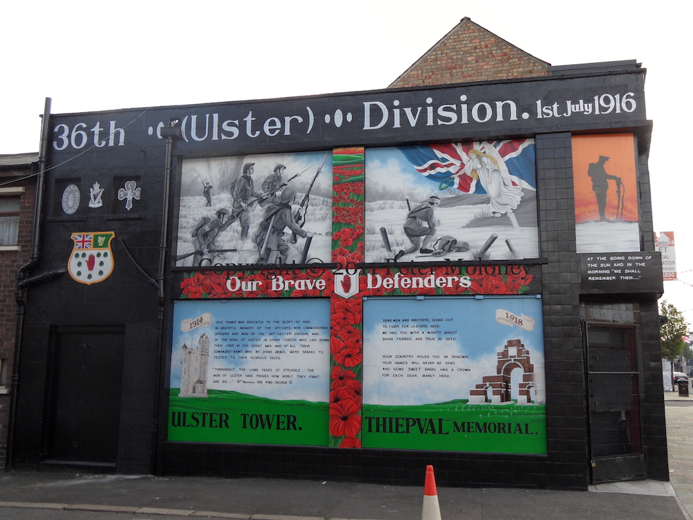 This is the completed version of the mural earlier shown in-progress. The four main panels show the men of the 36th (Ulster) Division going over the top on the first day of the Somme (1st July 1916), the “angel of Mons” (WP), Ulster Tower (“This tower was dedicated to the glory of God. In grateful memory of the officers, non commissioned officers and men of the 36th (Ulster) Division, and of the sons of Ulster in other forces who laid down their lives in the great war, and of all their comrades in arms who, by divine grace, were spared to testify to their glorious deeds. ‘Throughout the long years of struggle …. the men of Ulster have proved how nobly they fight and die’ – 16th November 1918 King George V”), and Thiepval Memorial (“Dear men and brothers, going out/to fight for Ulster’s need/we hail you with a mighty shout/brave friends, and true in deed.//Your country holds you in renown/your names will never be dead/and some sweet angel has a crown/for each dear, manly head.”)