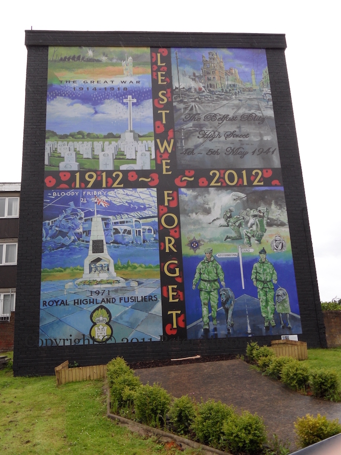 “Lest we forget – 1912-2012”: “The four panels of the mural represent images from conflict over the past 100 years … the Great War … Luftwaffe raids during the early years of the Second World War … the dark period in our history known as the Troubles … more recent conflicts in Iraq and Afghanistan. Part of the Arts Council for Northern Ireland’s Re-imaging Communities Programme – thiis project placed artist Jim Russell in the heart of the Sunningdale community to work with local people to create a more welcoming environment for everyone.”