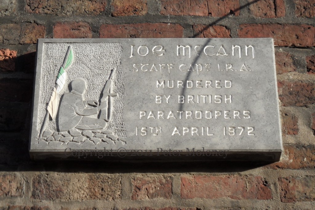 “Joe McCann Staff Capt. [Official] IRA. Murdered by British paratroopers 15th April 1972.” Joe McCann was (Official) IRA OC in the Markets area of south Belfast, where he was shot by paratroopers in 1972. The graven image to the left reproduces a famous photograph which shows McCann, with MI, during the occupation of the Inglis bakery in the Markets on August 9th, 1971 – Internment Day (see RN).