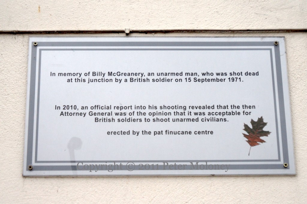 “In memory of Billy McGreanery, an unarmed man, who was shot dead at this junction by a British soldier on 15 September 1971. In 2010, an official report into his shooting revealed that the then Attorney General was of the opinion that it was acceptable for British soldiers to shoot unarmed civilians. Erected by the Pat Finucane Centre.