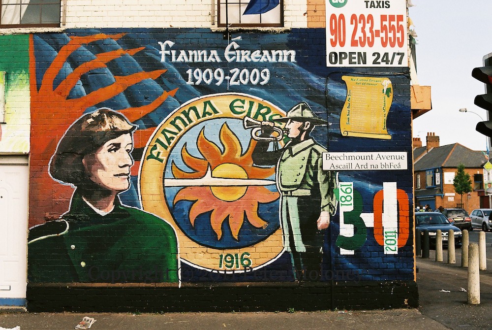 “Strength in our hearts, strength of our limbs, consistency of our tongues.” “Na Fıanna Ard Eoın 1909-2009 – one hundred years of resistance. In proud memory Fıan Davy McAuley … Josh Campbell … Josie McComiskey … Bernard Fox. ‘You may kill the revolutionary, but never the revolution.’ Dedicated by the Republican Network for Unity.” The four deceased are portrayed on four small boards, along with standing figures of Fianna from both centuries.