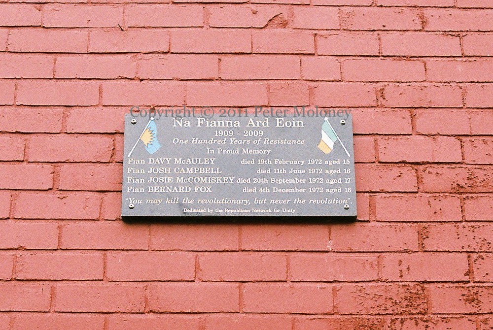 Commemorating “one hundred years of resistance” (1909-2009) in Berwick Road, Ardoyne: a plaque to Fıanna Davy McAuley, Josh Campbell, Josie McComiskey, and Bernard Fox, all of whom died in 1972. “You may kill the revolutionary, but never the revolution.” “Dedicated by the Republican Network For Unity.”