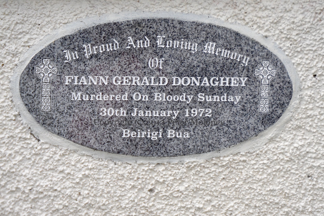 “In proud and loving memory of Fiann [sic] Gerald Donaghey, murdered on Bloody Sunday, 30th January 1972. Beirigí bua.” Donaghey was killed by the same bullet that also killed Gerard McKinney. The plaque is at the (modern-day) spot where he died, on the outside of Glenfada Park (south).