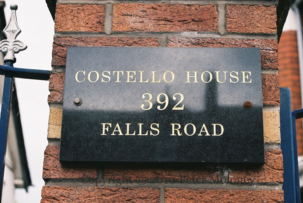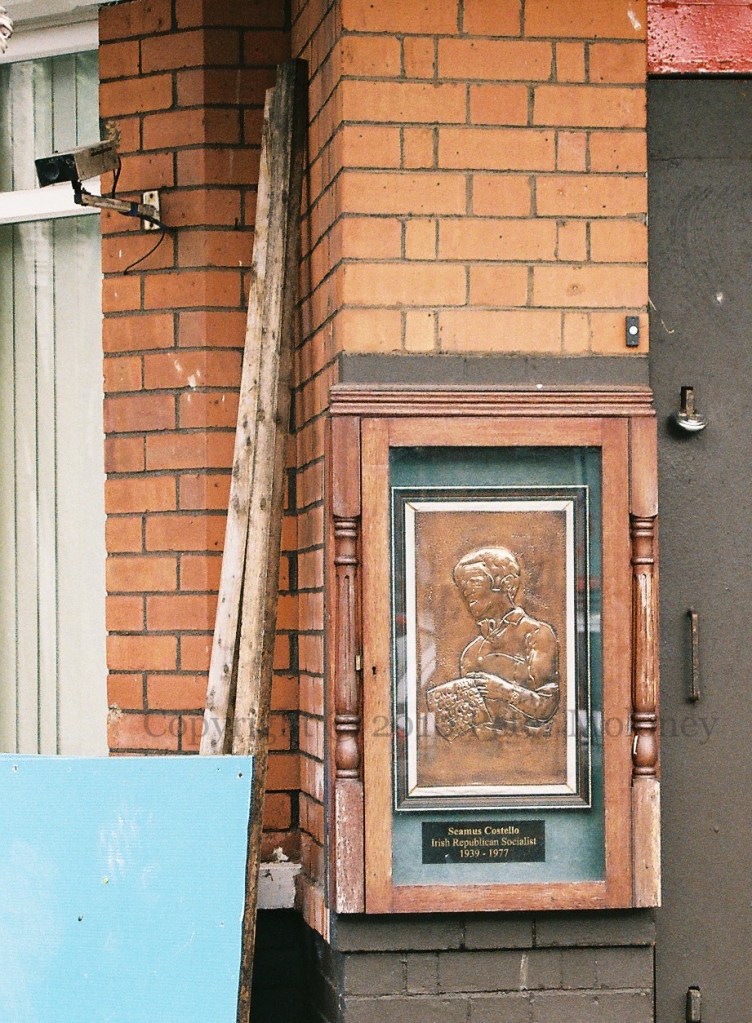 The Patsy O’Hara (IRSP/INLA) mural (dating back to 2006) in Bishop Street is paint-bombed. It would be quickly repaired. The image of the info board is from 2015.