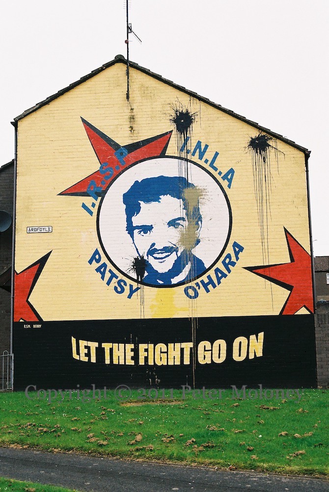 The Patsy O’Hara (IRSP/INLA) mural (dating back to 2006) in Bishop Street is paint-bombed. It would be quickly repaired. The image of the info board is from 2015.