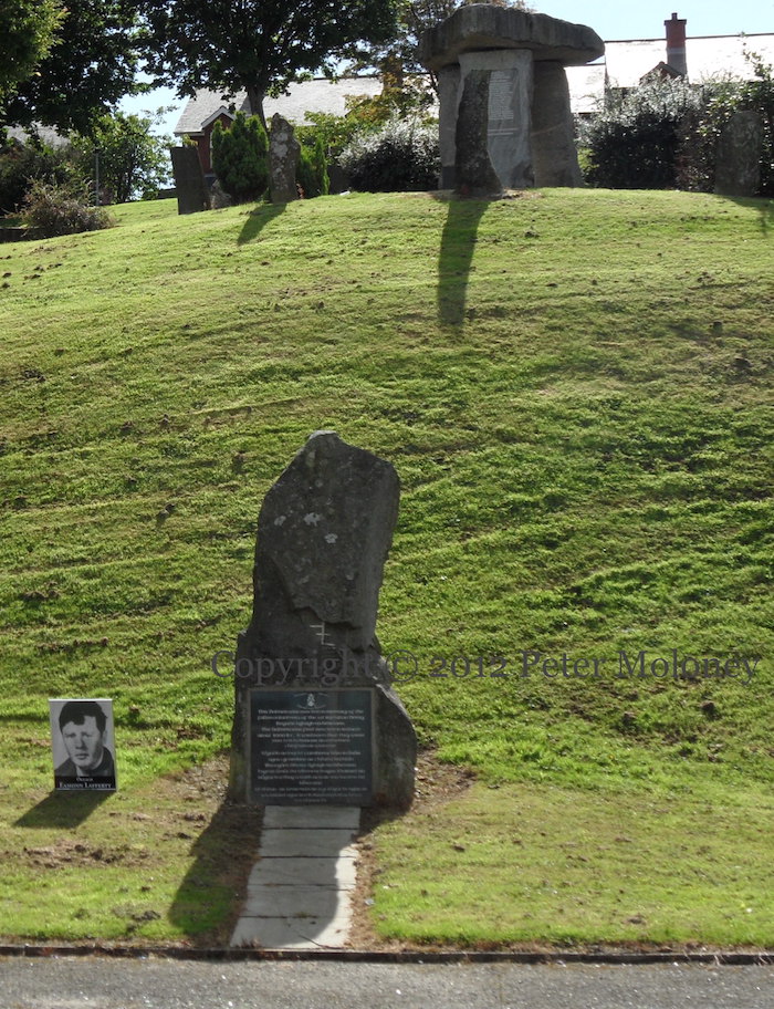 For the anniversary of his death, a poster of Volunteer Eamonn Lafferty is placed alongside the ogham stone and dolmen to the 1st battalion, Derry Brigade, IRA. Lafferty was killed on August 18th, 1971 – there are both a mural and a headstone to his memory in Kildrum Gardens.