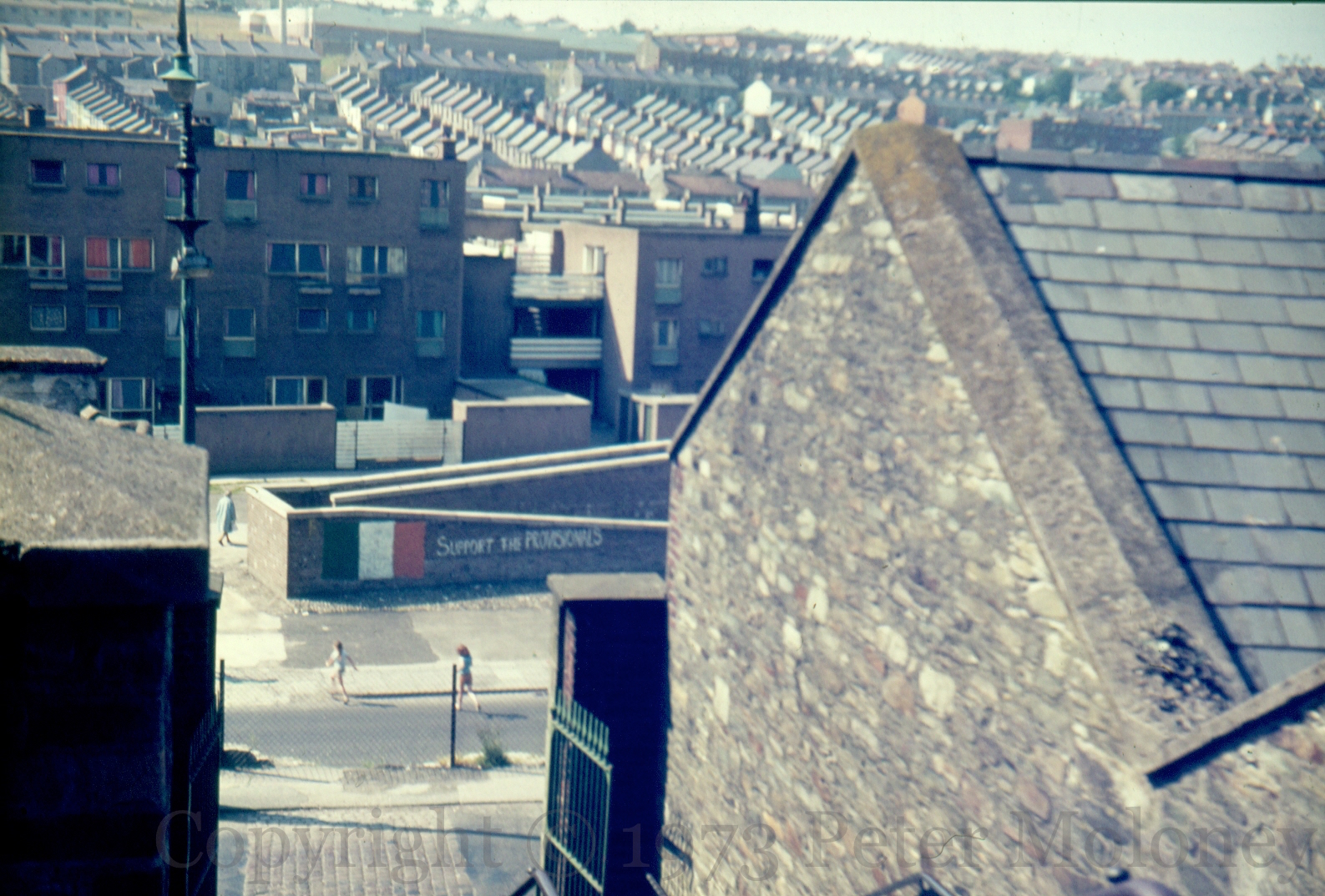 On the side of the Bogside Inn on Westland Street, Derry: “Easter 1916”, “1975” (suggesting that the date in the catalogue is wrong), “PIRA Provos”. The lower-level graffiti was painted out in 1981 – see Westland Street, 1981
