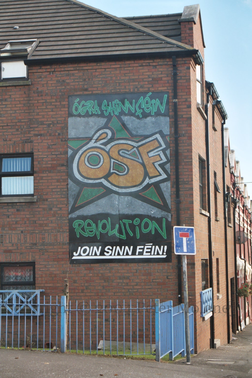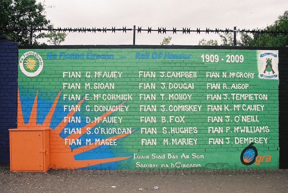 For the 100th anniversary of Na Fıanna Éıreann, a memorial mural on Racecourse Road, Derry, to Fıanna G. McAuley, Sloan, McCormick, Donaghy, D. McAuley, O’Riordan, Magee, Campbell, Dougal, Molloy, Comiskey, Fox, Hughes, Marley, McCrory, Alsop, Templeton, McCauley, O’Neill, McWilliams, Dempsey. The names are listed in the order of death, from earliest to latest, beginning with fifteen-year-old Gerald McAuley who was shot dead in Clonard (Belfast) in 1969, and ending with John Dempsey shot on the Falls Road (Belfast) in 1981. “Fuaır sıad bás ar son saoırse na hÉıreann.”
