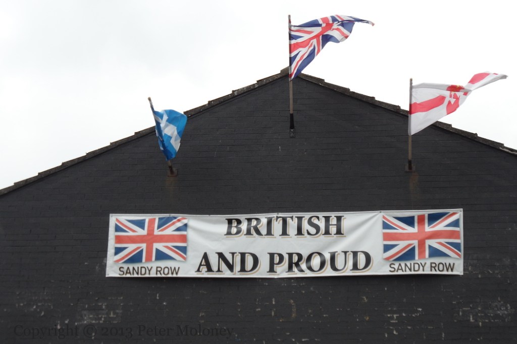 Loyalists on Sandy Row are not friends of Sinn Féin, the IRA, the PSNI, and all taigs. “We will always walk Ardoyne” is a reference to parading past the Ardoyne shops – the Parades’ Commission banned the march along that part of the route, and rioting took place (BBC).